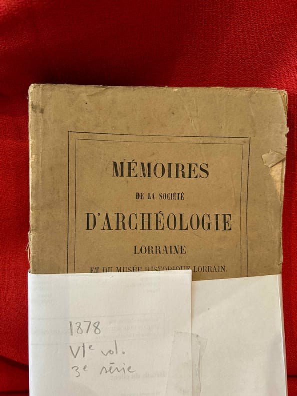 Nancy, Imprimerie de G. Crépin-Leblond, 1878 ; in-8, 416-XX pp. + 26 pl. hors-texte, broché. Sommaire: Léopold QUINTARD: Le Cimetière franc du Champ des Tombes, à Pompey, p. 5./ Léopold QUINTARD: Un Teston de Nicolas de Vaudémont, p. 23./ Joseph-Alexandre SCHMIT: Simples notes pour servir à la géographie ancienne du territoire de Contrexéville, p. 26./ Alexandre-Marie-Auguste BRETAGNE: Médaille de Renée de Bourbon, duchesse de Lorraine, p. 46./ Stanislas THOMAS: Courte notice sur Malzéville, p. 60./ Claude BONNABELLE: Notice sur la ville d'Étain, p. 73./ Henri LEPAGE: L’Abbaye de Saint-Martin-devant-Metz, p. 109./ Ferdinand DES ROBERT (1): Un pensionnaire des rois de France à Metz. – Richard de la Pôle, duc de Suffolk, p. 239./ Francis de CHANTEAU: Notice historique et archéologique sur le château de Montbras (Meuse), p. 269./ Justin FAVIER: Moeurs et usages des étudiants de l'Université de Pont-à-Mousson, p. 299./ Jules RENAULD: Henri de Lorraine, duc de Guise, et Catherine de Clèves, son épouse, p. 361./ E.-D. DUPEUX: Sur l'autel consacré à Hercule Saxanus, conservé au Musée lorrain, p. 394./ Liste des Sociétés savantes avec lesquelles la Société d'Archéologie échange ses publications, p. 413./ Liste des publications qui sont envoyées à la Société, p. 416./ Liste des membres de la Société (paginé I à XX), p. 417. Planches: Léopold QUINTARD: Objets trouvés au Champ des Tombes, p. 6, p. 12./ Teston inédit de Nicolas de Vaudémont, p. 23./ Joseph-Alexandre SCHMIT: Carte du territoire de Contrexéville, p. 26./ Joseph-Alexandre SCHMIT: Tracé de la voie romaine du Haut de Salin, p. 26./ Médaille de Renée de Bourbon et jetons à la légende «da pacem Domine in diebus nostris», p. 55./ CASSEI: Église de Malzéville. – Vue extérieure, p. 67./ CASSEI: Église de Malzéville. – Vue intérieure, p. 67./ Constant LAPAIX: Armoiries de la ville d'Étain, p. 94./ Figure de l'empereur Lothaire, p. 114./ Constant LAPAIX et René WIENER: Sceaux des abbés de Saint-Martin-devant-Metz, p. 172, p. 176, p. 178./ Constant LAPAIX: Sceau de l'abbaye, p. 180./ MATHIEU, d'Épinal, et Mlles VOLFROM: Vignettes et lettres initiales du manuscrit de la Vie de saint Martin, p. 194./ Francis de CHANTEAU: Plan du château de Montbras; armoiries et monogrammes, p. 282./ Château de Montbras. – Vue prise de la cour d'honneur, p. 284./ Albert de FÉRIET: Château de Montbras. – Vue prise de la terrasse, p. 285./ Justin FAVIER: Groupe d'étudiants de l'Université de Pont-à-Mousson, p. 337./ Justin FAVIER: Bachelier de la Faculté de théologie, professeurs, etc., p. 339./ Tombeau de Henri de Lorraine, duc de Guise, dit le Balafré, dans la chapelle du collège d'Eu, p. 387./ Autels consacrés à Hercule Saxanus, p. 396, p. 398./ Figure d'Hercule saxon, p. 409.