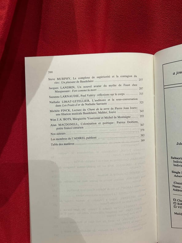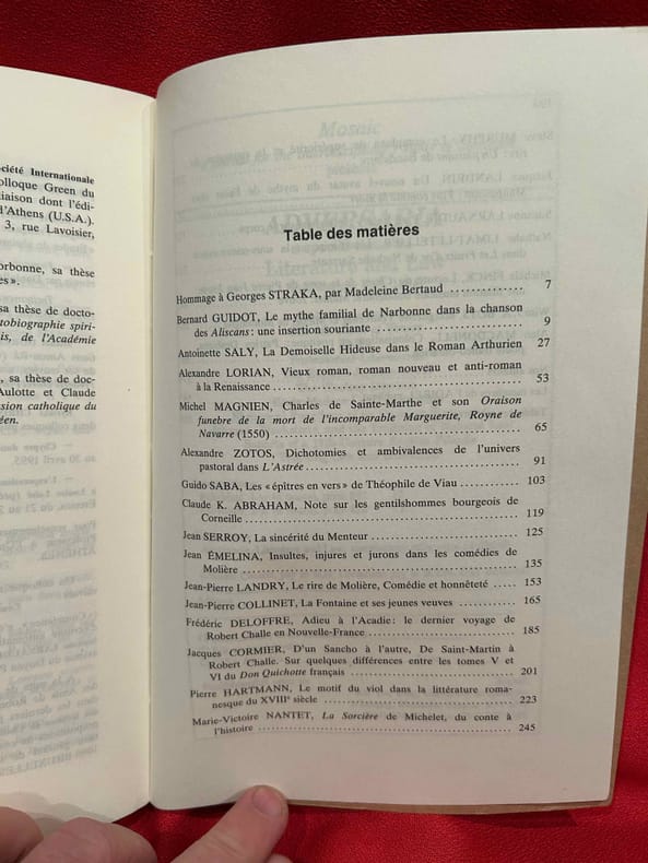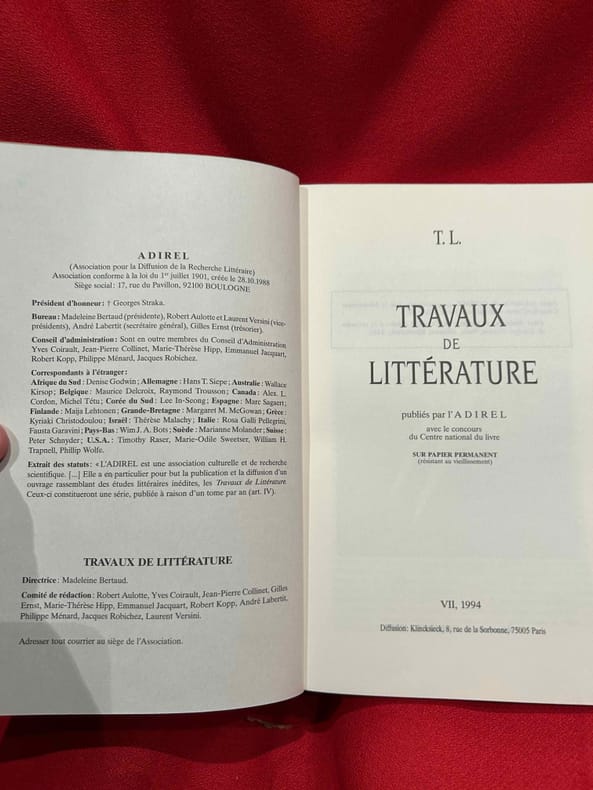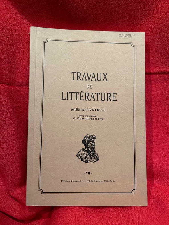 Boulogne, A.D.i.R.E.L., 1994 ; in-8 (161 x 240 mm), 392 pp., broché. Sommaire: Madeleine BERTAUD: Hommage à Georges Straka, p. 4./ Bernard GUIDOT: Le mythe familial de Narbonne dans la chanson des «Aliscans": une insertion souriante, p. 9./ Antoinette SALY: La Demoiselle Hideuse dans le Roman Arthurien, p. 27./ Alexandre LORIAN: Vieux roman, roman nouveau et anti-roman à la Renaissance, p. 53./ Michel MAGNIEN: Charles de Sainte-Marthe et son «Oraison funebre de la mort de l'incomparable Marguerite, Royne de Navarre» (1550), p. 65./ Alexandre ZOTOS: Dichotomies et ambivalences de l'univers pastoral dans «L’Astrée»; p. 91./ Guido SABA: Les «épîtres en vers» de Théophile de Viau, p. 103./ Claude K. ABRAHAM: Note sur les gentilshommes bourgeois de Corneille, p. 119./ Jean SERROY: La sincérité du Menteur, p. 125./ Jean ÉMELINA: Insultes, injures et jurons dans les comédies de Molière, p. 135./ Jean-Pierre LANDRY: Le rire de Molière, Comédie et honnêteté, p. 153./ Jean-Pierre COLLINET: La Fontaine et ses jeunes veuves, p. 165./ Frédéric DELOFFRE: Adieu à l'Acadie: le dernier voyage de Robert Challe en Nouvelle-France, p. 185./ Jacques CORMIER: D'un Sancho à l'autre, De Saint-Martin à Robert Challe. Sur quelques différences entre les tomes V et VI du «Don Quichotte» français, p. 201./ Pierre HARTMANN: Le motif du viol dans la littérature romanesque du XVIIIe siècle, p. 223./ Marie-Victoire NANTET: «La Sorcière» de Michelet, du conte à l’histoire, p. 245./ Steve MURPHY: Le complexe de supériorité et la contagion du rire: «Un plaisant» de Baudelaire, p. 257./ Jacques LANDRIN: Un nouvel avatar du mythe de Faust chez Maupassant: «Fort comme la mort», p. 287./ Suzanne LARNAUDIE: Paul Valéry: réflexions sur le corps, p. 315./ Nathalie LIMAT-LETELLIER: L'auditoire et la sous-conversation dans «Les Fruits d’or» de Nathalie Sarraute, p. 325./ Michèle FINCK: Lecture du «Chant de la terre» de Pierre-Jean Jouve: une filiation musicale Baudelaire, Malher, Jouve, p. 345./ Wim J. A. BOTS: Marguerite Yourcenar et Michel de Montaigne, p. 355./ Alan MACDONELL: Colonisation et poétique: Patrice Desbiens, poète franco-ontarien, p. 367./ Nos auteurs, p. 379./ Les membres de l’ ADIREL publient, p. 383./ Table des matières, p. 389. Quelques illustrations en noir et blanc.