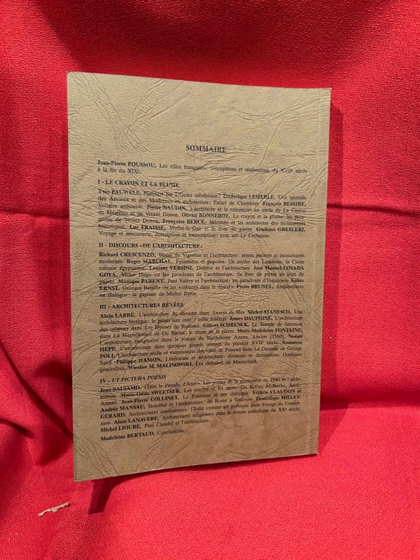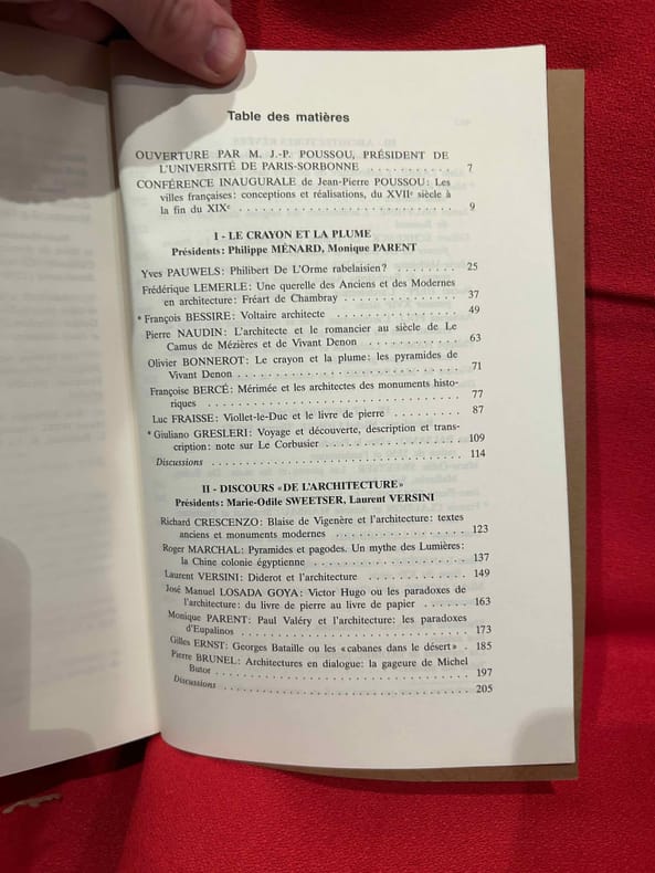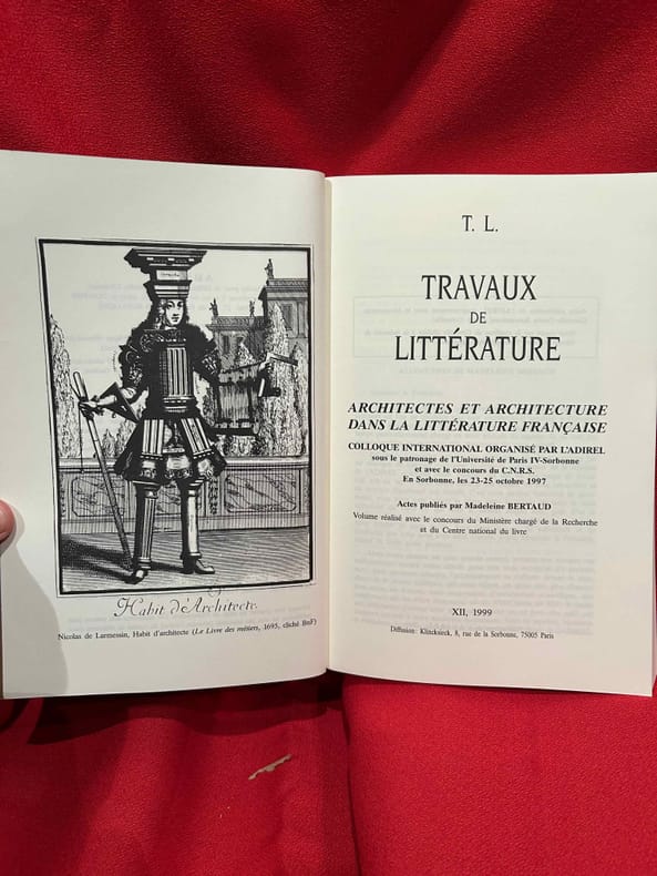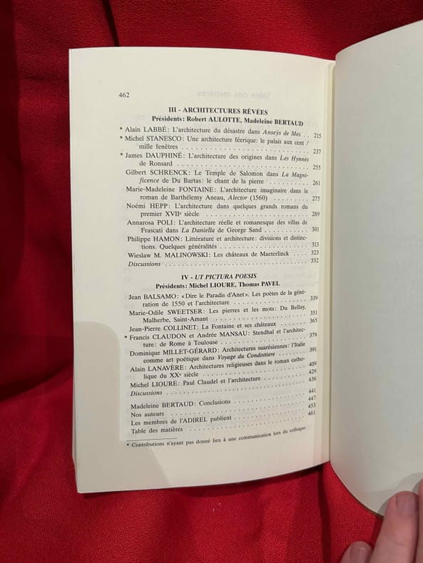 Boulogne, A.D.I.R.E.L., 1999 ; in-16 (161 x 240 mm), Broché. "Colloque international organisé par l'ADIREL, en Sorbonne, les 23-25 octobre 1997. Actes publiés par Madeleine BERTAUD. Sommaire: I. – Le Crayon et La Plume. – Yves PAUWELS: Philibert De L'Orme rabelaisien?, p. 25./ Frédérique LEMERLE: Une querelle des Anciens et des Modernes en architecture: Fréart de Chambray, p. 37./ François BESSIRE: Voltaire architecte, p. 49./ Pierre NAUDIN: L'architecte et le romancier au siècle de Le Camus de Mézières et de Vivant Denon, p. 63./.Olivier BONNEROT: Le crayon et la plume: les pyramides de Vivant Denon, p. 71./ Françoise BERCÉ: Mérimée et les architectes des monuments historiques, p. 77./ Luc FRAISSE: Viollet-le-Duc et le livre de pierre, p. 87./ Giuliano GRESLERI: Voyage et découverte, description et transcription: note sur Le Corbusier, p. 109./ II. – Discours «de l'Architecture». – Richard CRESCENZO: Blaise de Vigenère et l'architecture: textes anciens et monuments modernes, p. 123./ Roger MARCHAL: Pyramides et pagodes. Un mythe des Lumières: la Chine colonie égyptienne, p. 137./ Laurent VERSINI: Diderot et l’architecture, p. 149./ José Manuel LOSADA GOYA: Victor Hugo, ou les paradoxes de l'architecture: du livre de pierre au livre de papier, p. 163./ Monique PARENT: Paul Valéry et l'architecture: les paradoxes d’Eupalinos, p. 173./ Gilles ERNST: Georges Bataille, ou les «cabanes dans le désert», p. 185./ Pierre BRUNEL: Architectures en dialogue: la gageure de Michel Butor, p. 197./ III. – Architectures rêvées. – Alain LABBÉ: L'architecture du désastre dans «Anseÿs de Mes», p. 215./ Michel STANESCO: Une architecture féerique: le palais aux cent / mille fenêtres, p. 237./ James DAUPHINÉ: L'architecture des origines dans «Les Hynnes» de Ronsard, p. 255./ Gilbert SCHRENCK: Le Temple de Salomon dans «La Magnificence» de Du Bartas: le chant de la pierre, p. 261./ Marie-Madeleine FONTAINE: L'architecture imaginaire dans le roman de Barthélemy Aneau, «Alector" (1560), p. 275./ Noémi HEPP: L'architecture dans quelques grands romans du premier XVIIe siècle, p. 289./ Annarosa POLI: L'architecture réelle et romanesque des villas de Frascati dans «La Daniella» de George Sand, p. 301./ Philippe HAMON: Littérature et architecture: divisions et distinctions: Quelques généralités, p. 313./ Wieslaw M. MALINOWSKI: Les châteaux de Maeterlinck, p. 323./ IV. – Ut Pictura Poesis. – Jean BALSAMO: «Dire le Paradis d’Anet». Les poètes de la génération de 1550 et l’architecture, p. 339./ Marie-Odile SWEETSER: Les pierres et les mots: Du Bellay, Malherbe, Saint-Amant, p. 351./ Jean-Pierre COLLINET: La Fontaine et ses châteaux, p. 365./ Francis CLAUDON et Andrée MANSAU: Stendhal et l’architecture: de Rome à Toulouse, p. 379./ Dominique MILLET-GÉRARD: Architectures suarésiennes: l’Italie comme art poétique dans «Voyage de Condottiere», p. 391./ Alain LANAVÈRE: Architectures religieuses dans le roman catholique du XXI siècle, p. 409./ Michel LIOURE: Paul Claudel et l’architecture, p. 429./ Madeleine BERTAUD: Conclusions, p. 441./ Nos auteurs, p. 447./ Les membres de l’ ADIREL publient, p. 453./ Table des matières, p. 461. " -Quelques illustrations en noir et blanc.