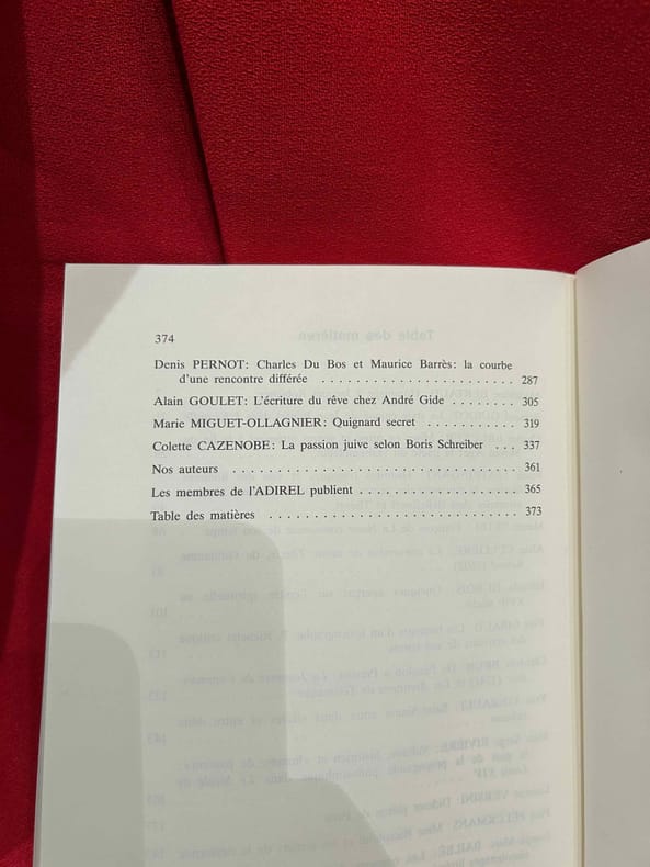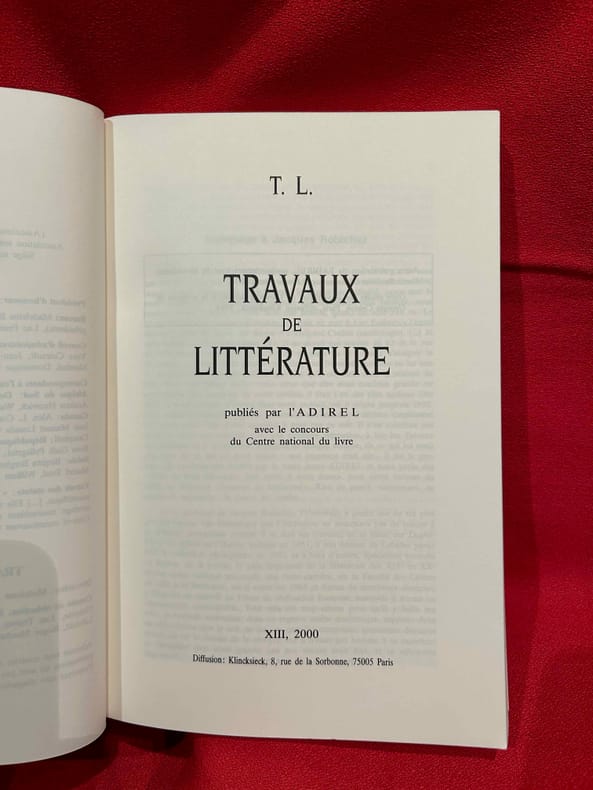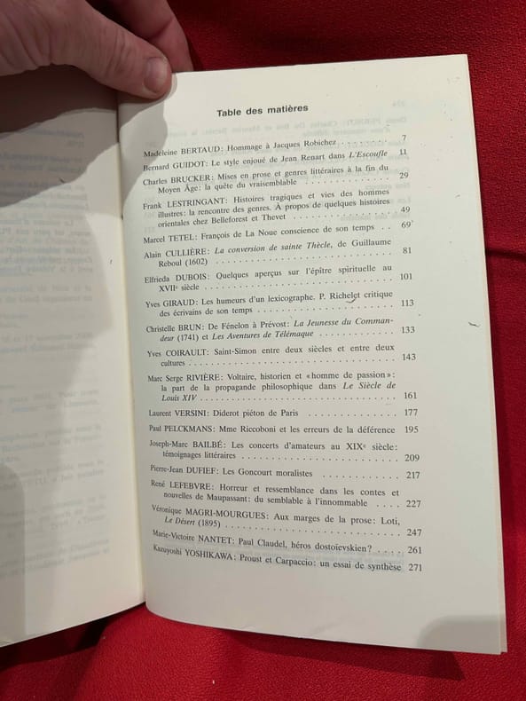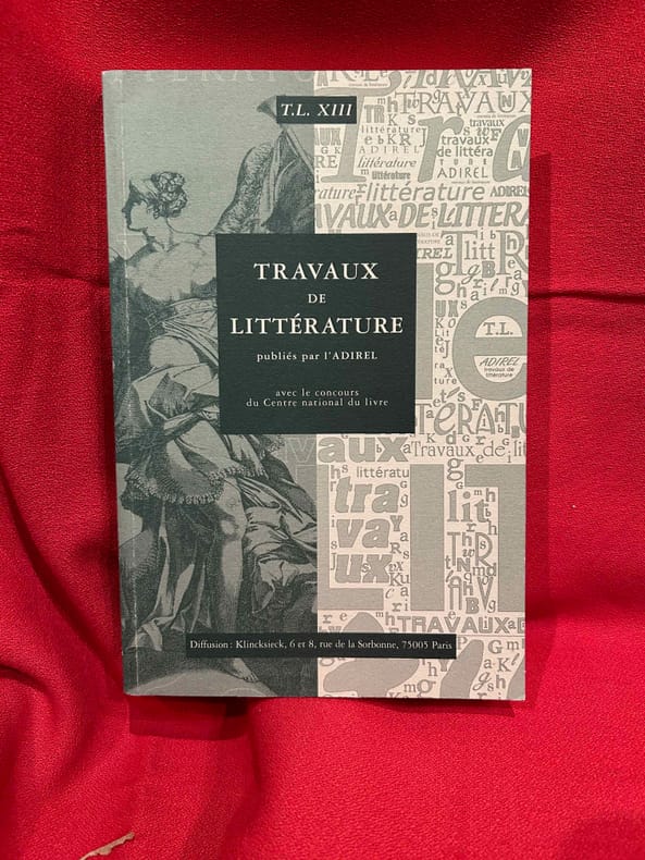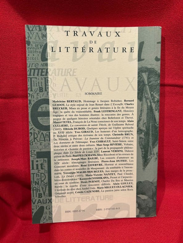 Boulogne, A.D.i.R.E.L., 2000 ; in-8 (161 x 240 mm), 376 pp., broché. Sommaire: Madeleine BERTAUD: Hommage à Jacques Robichez, p. 7./ .Bernard GUIDOT: Le style enjoué de Jean Renart dans «L’Escoufle», p. 11./ Charles BRUCKER: Mises en prose et genres littéraires à la fin du Moyen Âge: la quête du vraisemblable, p. 29./ Frank LESTRINGANT: Histoires tragiques et vies des hommes illustres: la rencontre des genres. À propos de quelques histoires orientales chez Belleforest et Thevet, p. 49./ Marcel TETEL: François de La Noue conscience de son temps, p. 69./ Alain CUILLÈRE: «La conversion de sainte Thècle», de Guillaume Reboul (1602), p. 81./ Elfrieda DUBOIS: Quelques aperçus sur l'épître spirituelle au XVIIe siècle, p. 101./ Yves GIRAUD: Les humeurs d'un lexicographe. P. Richelet critique des écrivains de son temps, p. 113./ Christelle BRUN: De Fénelon à Prévost: «La Jeunesse du Commandeur» (1741) et «Les Aventures de Télémaque», p. 133./ Yves COIRAULT: Saint-Simon entre deux siècles et entre deux cultures, p. 143./ Marc-Serge RIVIERE: Voltaire, historien et «homme de passion»: la part de la propagande philosophique dans «Le Siècle de Louis XIV», p. 161./ Laurent VERSINI: Diderot piéton de Paris, p. 177./ Paul PELCKMANS: Mme Riccoboni et les erreurs de la déférence, p. 195./ Joseph-Marc BAILBÉ: Les concerts d'amateurs au XIXe siècle: témoignages littéraires, p. 209./ Pierre-Jean DUFIEF: Les Goncourt moralistes, p. 217./ René LEFEBVRE: Horreur et ressemblance dans les contes et nouvelles de Maupassant: du semblable à l’innommable, p. 227./ Véronique MAGRI-MOURGUES: Aux marges de la prose: Loti, «Le Désert» (1895), p. 247./ Marie-Victoire NANTET: Paul Claudel, héros dostoïevskien?, p. 261./ Kazuyoshi YOSHIKAWA: Proust et Carpaccio: un essai de synthèse, p. 271./ Denis PERNOT: Charles Du Bos et Maurice Barrès: la courbe d'une rencontre différée, p. 287./ Alain GOULET: L'écriture du rêve chez André Gide, p. 305./ Marie MIGUET-OLLAGNIER: Quignard secret, p. 319./ Colette CAZENOBE: La passion juive selon Boris Schreiber, p. 337./ Nos auteurs, p. 361./ Les membres de l’ ADIREL publient, p. 365./ Table des matières, p. 373. Quelques illustrations en couleurs.