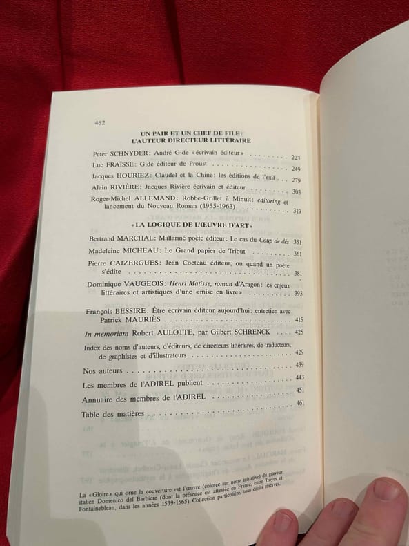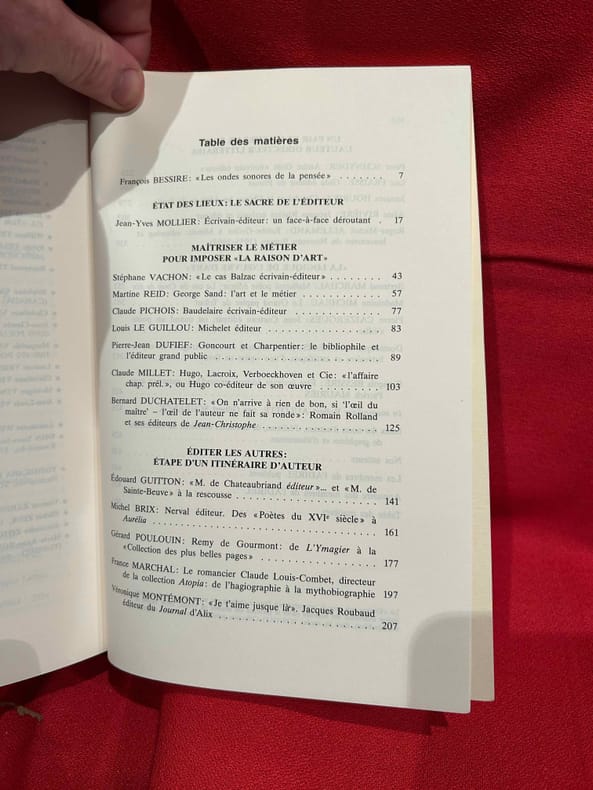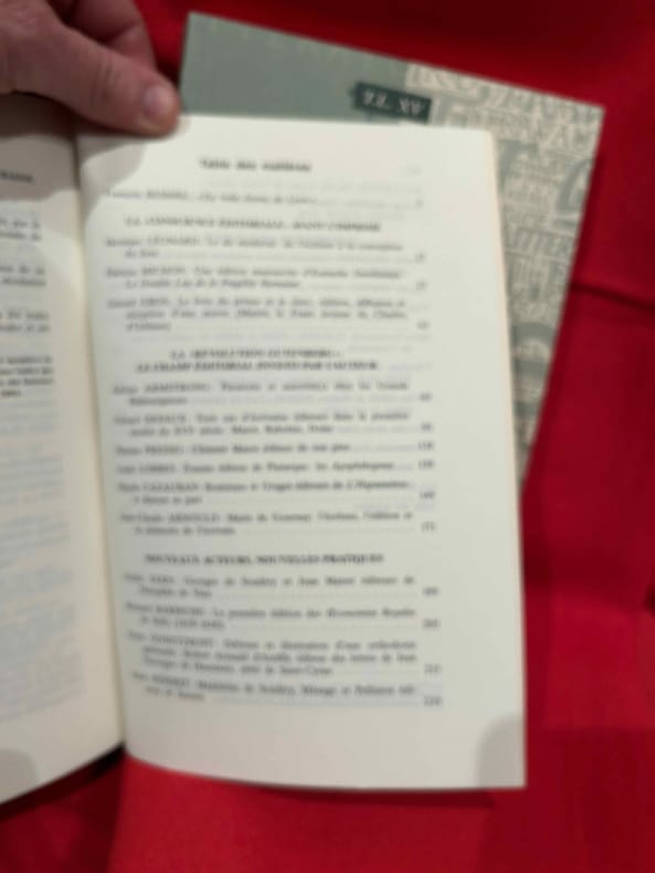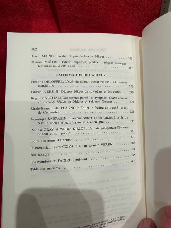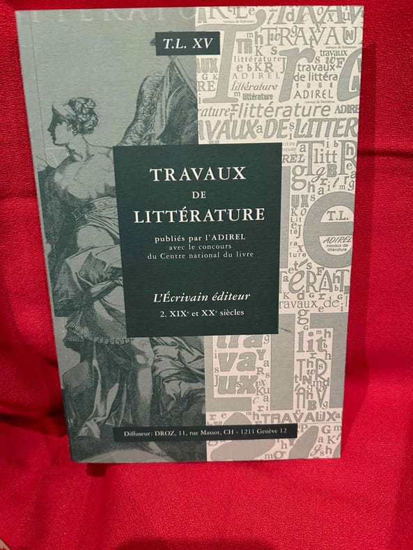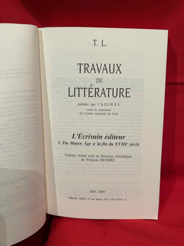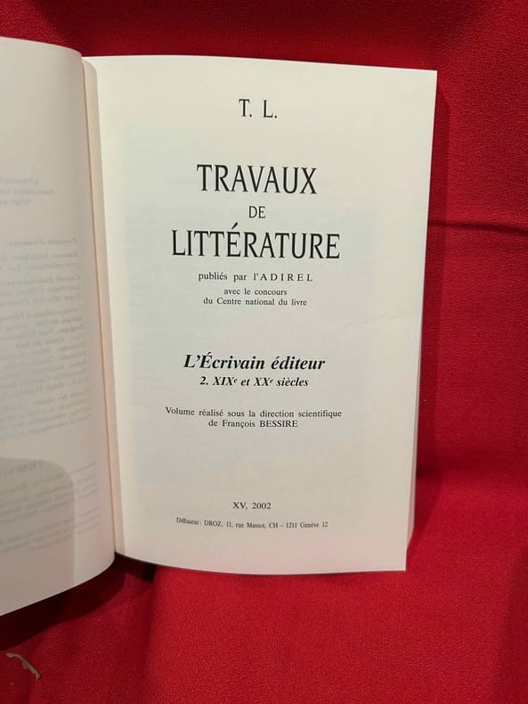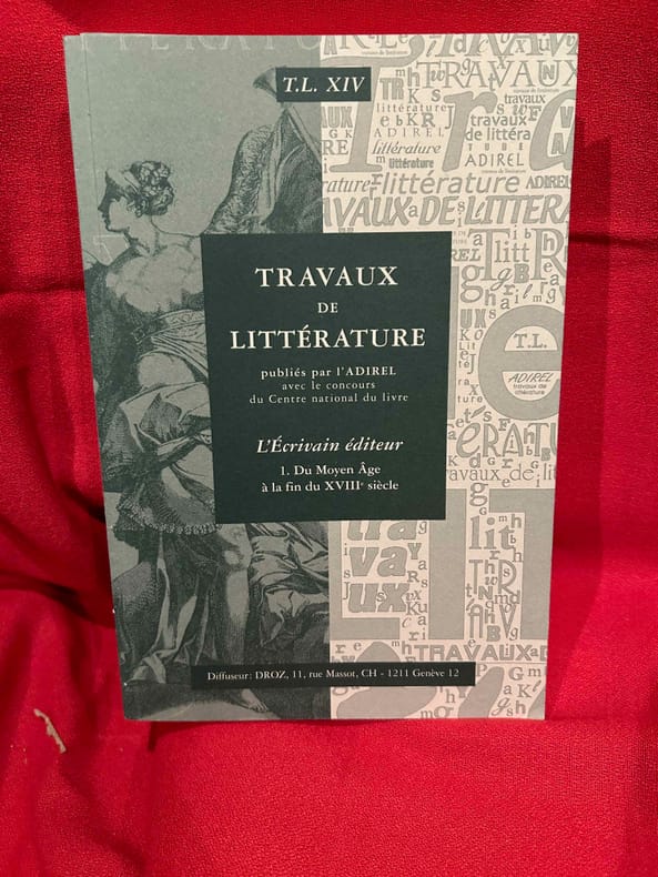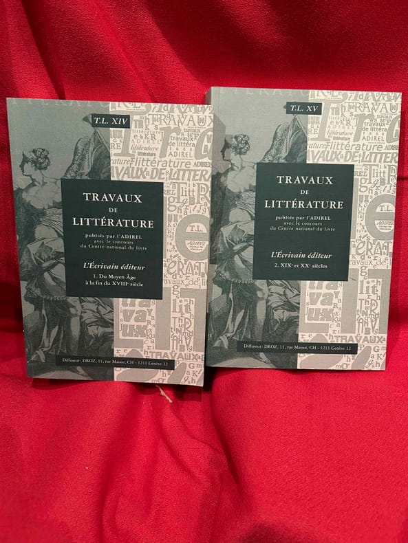 Boulogne, A.D.i.R.E.L., 2001-2002 ; in-8 (161 x 240 mm), 404 + 464 pp., brochés. Les 2 volumes. Sommaire: François BESSIRE: «En belle forme de Livre», p. 7./ I. – La «Conscience éditoriale» avant l'imprimé. – Monique LÉONARD: Le «dit» médiéval: de l'écriture à la conception du livre, p. 17./ Patricia MICHON: Une édition manuscrite d'Eustache Deschamps: «Le Double Lay de la Fragilité Humaine», p. 27./ Gérard GROS: Le livre du prince et le clerc: édition, diffusion et réception d'une œuvre (Martin le Franc lecteur de Charles d’Orléans), p. 43./ II. – La «Révolution Gutenberg»: le champ éditorial investi par l'auteur. – Adrian ARMSTRONG: Paratexte et autorité(s) chez les Grands Rhétoriqueurs, p. 61./ Gérard DEFAUX: Trois cas d'écrivains éditeurs dans la première moitié du XVIe siècle: Marot, Rabelais, Dolet, p. 91./ Florian PREISIG: Clément Marot éditeur de son père, p. 119./ Louis LOBBES: Érasme éditeur de Plutarque: les «Apophthegmes», p. 139./ Nicole CAZAURAN: Boaistuau et Gruget éditeurs de «L’Heptaméron": à chacun sa part, p. 149./ Jean-Claude ARNOULD: Marie de Gournay: l'écriture, l'édition et la mémoire de l’écrivain, p. 171./ III. – Nouveaux Acteurs, nouvelles pratiques. – Guido SABA: Georges de Scudéry et Jean Mairet éditeurs de Théophile de Viau, p. 189./ Bernard BARBICHE: La première édition des «Œconomies Royales» de Sully (1638-1640), p. 205./ Denis DONETZKOFF: Défense et illustration d'une orthodoxie spirituelle: Arnaud d'Andilly éditeur des lettres de Jean Duvergier de Hauranne, abbé de Saint-Cyran, p. 215./ Alain NIDERST: Madeleine de Scudéry, Ménage et Pellisson éditeurs de Sarasin, p. 233./ Jean LAFOND: Un duc et pair de France éditeur, p. 243./ Myriam MAÎTRE: Éditer, imprimer, publier: quelques stratégies féminines au XVIIe siècle, p. 257./ IV. – L'Affirmation de l'auteur. Frédéric DELOFFRE: L'écrivain éditeur posthume dans la littérature clandestine, p. 279./ Laurent VERSINI: Diderot éditeur de soi-même et des autres, p. 399./ Roger MARCHAL: Des satyres parmi les nymphes: «Contes moraux et nouvelles idylles» de Diderot et Salomon Gessner, p. 309./ Marie-Emmanuelle PLAGNOL: Éditer le théâtre de société: le cas de Carmontelle, p. 321./ Véronique SARRAZIN: L'auteur éditeur de ses œuvres à la fin du XVIIIe siècle: aspects légaux et économiques, p. 335./ Patricia GRAY et Wallace KIRSOP: L'art du prospectus: l'écrivain éditeur et son public, p. 361./ Index des noms d’auteurs, p. 375./ In memoriam Yves Coirault, par Laurent VERSINI, p. 387./ Nos auteurs, p. 391./ Les membres de l’ ADIREL publient, p. 395./ Table des matières, p. 401. Sommaire: François BESSIRE: «Les ondes sonores de la pensée», p. 1./ I. – État des lieux: Le Sacre de l'éditeur. – Jean-Yves MOLLIER: Écrivain-éditeur: un face-à-face déroutant, p. 17./ II. – Maîtriser le métier pour imposer «La Raison d'Art». – Stéphane VACHON: «Le cas Balzac écrivain-éditeur», p. 43./ Martine REID: George Sand: l'art et le métier, p. 57./ Claude PICHOIS: Baudelaire écrivain-éditeur, p. 77./ Louis Le GUILLOU: Michelet éditeur, p. 83./ Pierre-Jean DUFIEF: Goncourt et Charpentier: le bibliophile et l'éditeur grand public, p. 89./ Claude MILLET: Hugo, Lacroix, Verboeckhoven et Cie: «l'affaire chap. prél.», ou Hugo co-éditeur de son œuvre, p. 103./ Bernard DUCHATELET: «On n'arrive à rien de bon, si «l'œil du maître» – l'œil de l'auteur ne fait sa ronde»: Romain Rolland et ses éditeurs de «Jean-Christophe», p. 125./ III. – Éditer les autres: Étape d'un itinéraire d'auteur. – Édouard GUITTON: «M. de Chateaubriand éditeur»… et «M. de Sainte-Beuve» à la rescousse, p. 141./ Michel BRIX: Nerval éditeur. Des «Poètes du XVIe siècle» à «Aurélia», p. 161./ Gérard POULOUIN: Remy de Gourmont: de «L’Ymagier" à la «Collection des plus belles pages», p. 177./ France MARCHAL: Le romancier Claude Louis-Combet, directeur de la collection «Atopia»: de l'hagiographie à la mythobiographie, p. 197./ Véronique MONTEMONT: «Je t'aime jusque-là». Jacques Roubaud éditeur du «Journal» d’Alix, p. 207./ IV. – Un Pair et un Chef de File: l'Auteur directeur littéraire. – Peter SCHNYDER: André Gide «écrivain éditeur», p. 223./ Luc FRAISSE: Gide éditeur de Proust, p. 249./ Jacques HOURIEZ: Claudel et la Chine: les éditions de l’exil, p. 279./ Alain RIVIERE: Jacques Rivière écrivain et éditeur, p. 303./ Roger-Michel ALLEMAND: Robbe-Grillet à Minuit: «editoring» et lancement du Nouveau Roman (1955-1963); p. 319./ V. – «La Logique de l'Œuvre d'Art». – Bertrand MARCHAL: Mallarmé poète éditeur : Le cas du «Coup de dés», p. 351./ Madeleine MICHEAU: Le «Grand papier de Tribut», p. 361./ Pierre CAIZERGUES: Jean Cocteau éditeur, ou quand un poète s’édite, p. 381./ Dominique VAUGEOIS: «Henri Matisse, roman» d'Aragon: les enjeux littéraires et artistiques d'une «mise en livre», p. 393./ François BESSIRE: Être écrivain éditeur aujourd'hui: entretien avec Patrick Mauriès, p. 415./ In memoriam Robert Aulotte, par Gilbert SCHRENCK, p. 425./ Index des noms d'auteurs, d'éditeurs, de directeurs littéraires, de graphistes et d’illustrateurs, p. 429./ Nos auteurs, p. 439./ Les membres de l’ ADIREL publient, p. 443./ Annuaire des membres de l’ADIREL, p. 451./ Table des matières, p. 461. Quelques illustrations en noir et blanc.