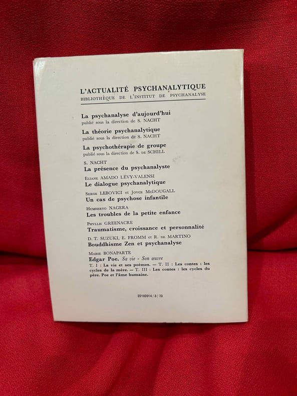 Paris, Presses Universitaires de France, 1973 ; in-8 (137 x 180 mm), 422 pp., broché, couverture illustrée. L’Actualité psychanalytique. Bibliothèque de l’Institut de Psychanalyse. Traduit par Yvette ROUDY et Georges RUSTIN.