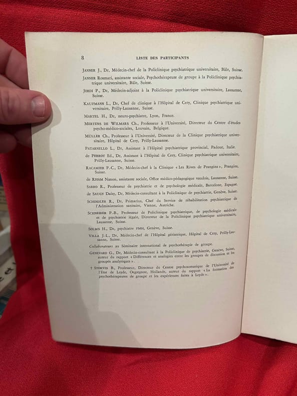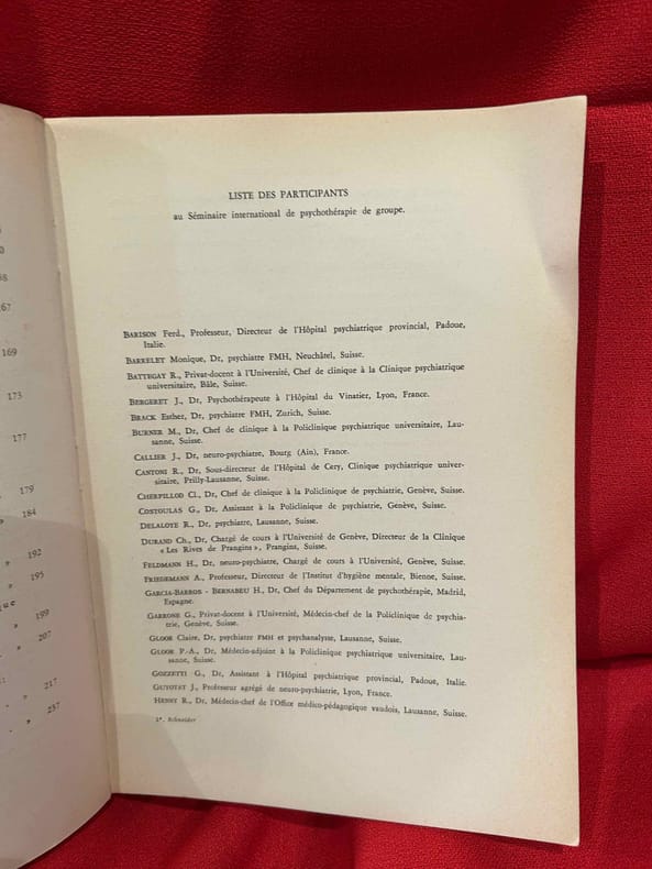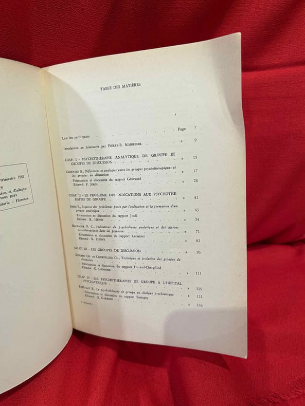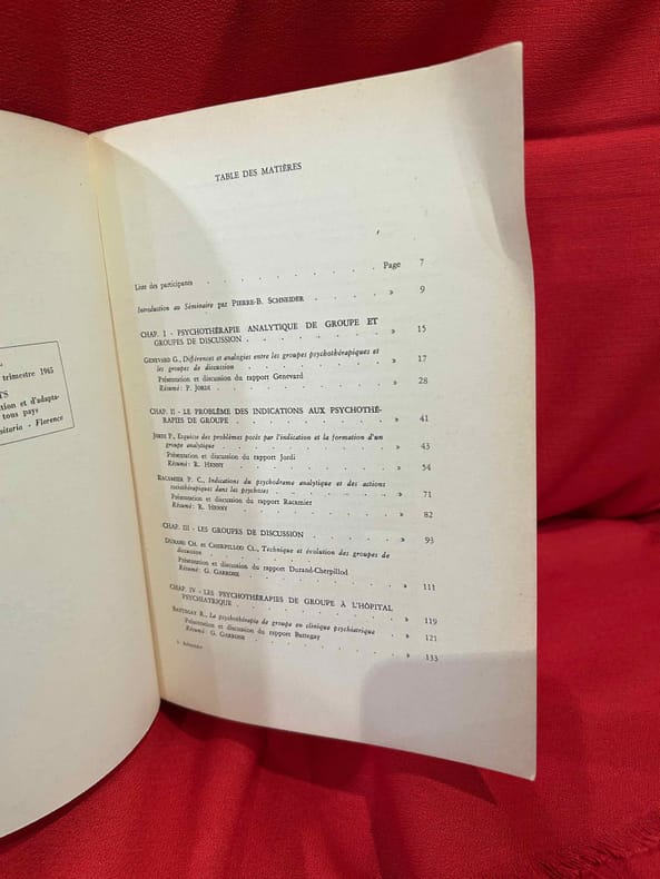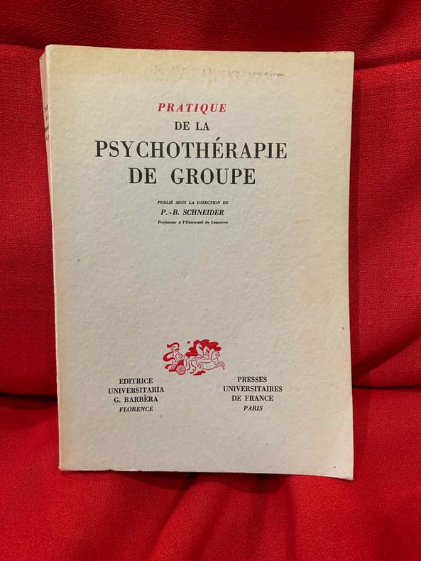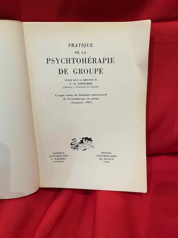 Compte rendu du Séminaire international de Psychothérapie de groupe (Lausanne, 1963), publié sous la direction de P.-B. Schneider - Paris / Florence : Presses Universitaires de France / Editrice Universitaria G. Barbèra, 1965 - in-8 broché, 238 pages - bon état -