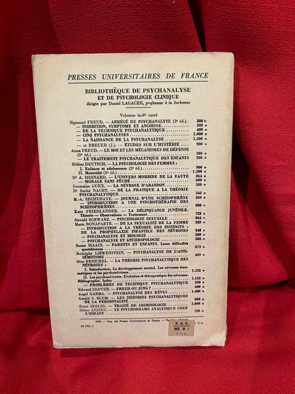 Presses Universitaires de France Presses Universitaires de France, Bibliothèque de Psychanalyse, 1979, 255 p., broché, bords de la couverture frottés, une étiquette de prix sur le second plat, une déchirure d'environ 2cm sur le bord supérieur du second plat, intérieur bien propre.