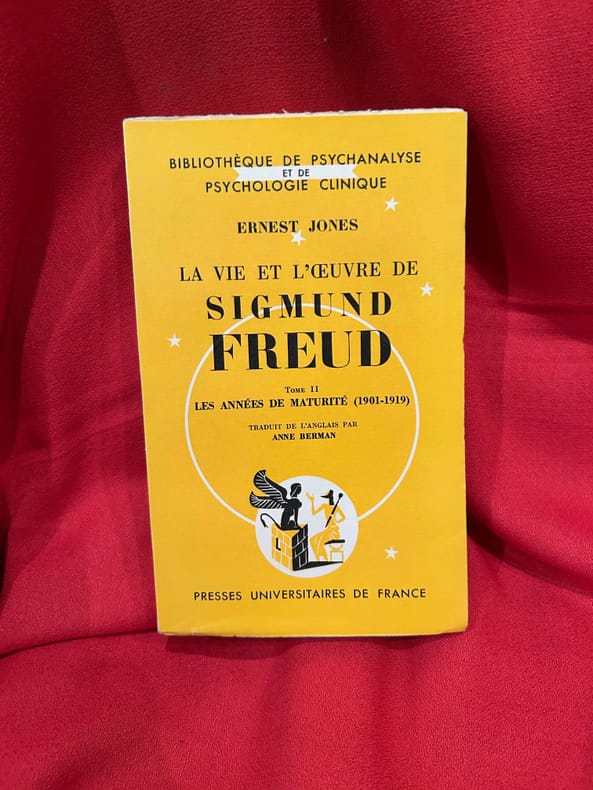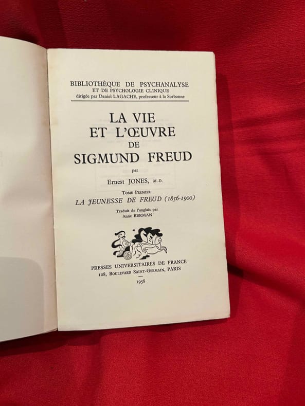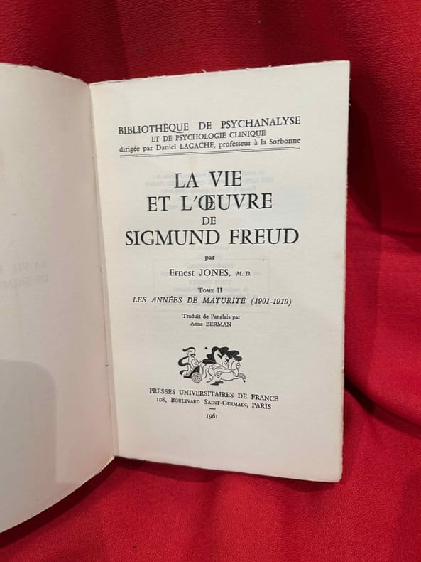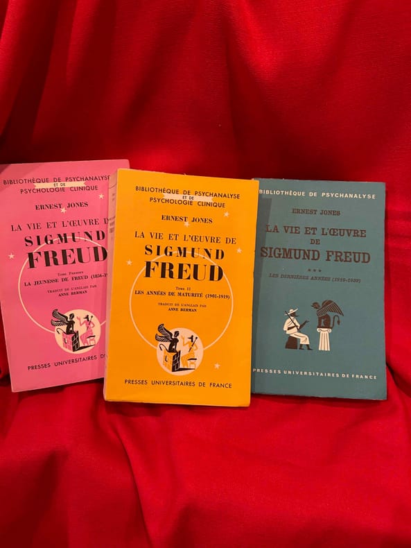 Paris, Presses Universitaires de France, 1958-1969 ; in-8 (143 x 227 mm), XII-456 + XII-516 + XVI-568 pp., broché, couverture illustrée. Les 3 volumes. Bibliothèque de Psychanalyse et de Psychologie clinique, dirigée par Daniel Lagache, professeur à la Sorbonne. Traduction de l'anglais par Anne Berman. T. Ier: La jeunesse de Freud (1856-1900). T. II: Les années de maturité (1901-1919). T. III: Les dernières années (1919-1939).