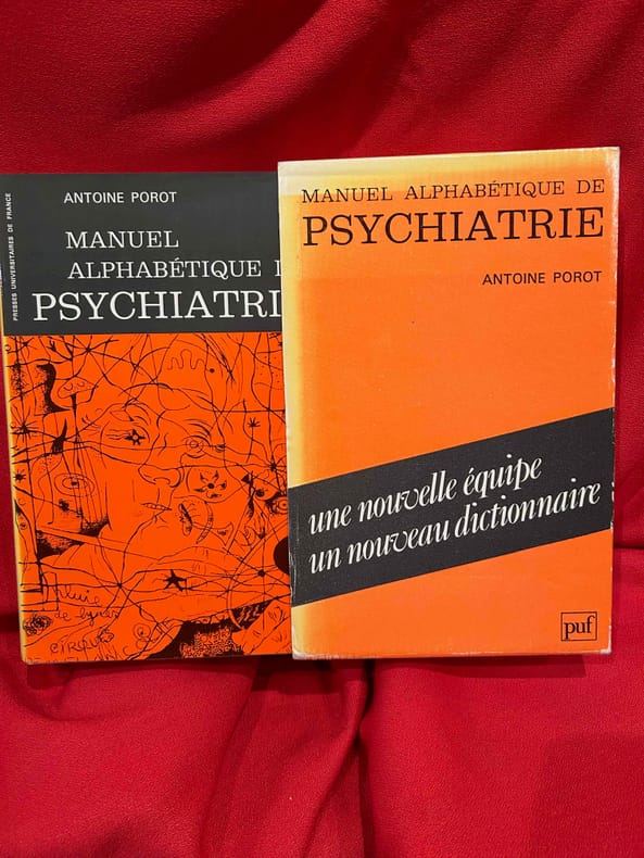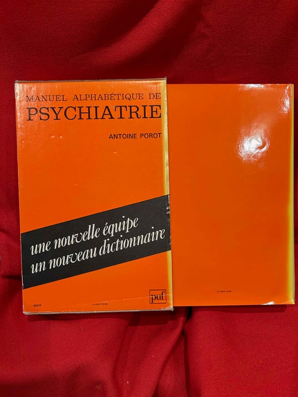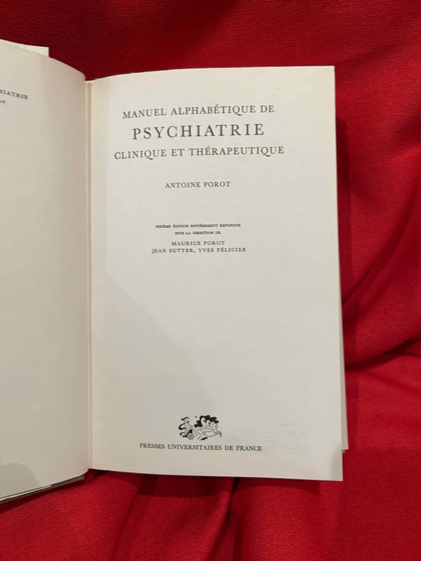 Paris, Presses Universitaires de France, 1984 ; in-8 (165 x 249 mm), X-756 pp., reliure d'éditeur pleine toile, coloris mastique, sous jaquette illustrée et sous emboîtage. Bibliothèque de Psychiatrie, dirigée par le Pr Jean Delay. 6ème édition entièrement refondue, sous la direction de Maurice Porot, Jean Sutter, Yves Pélicier.