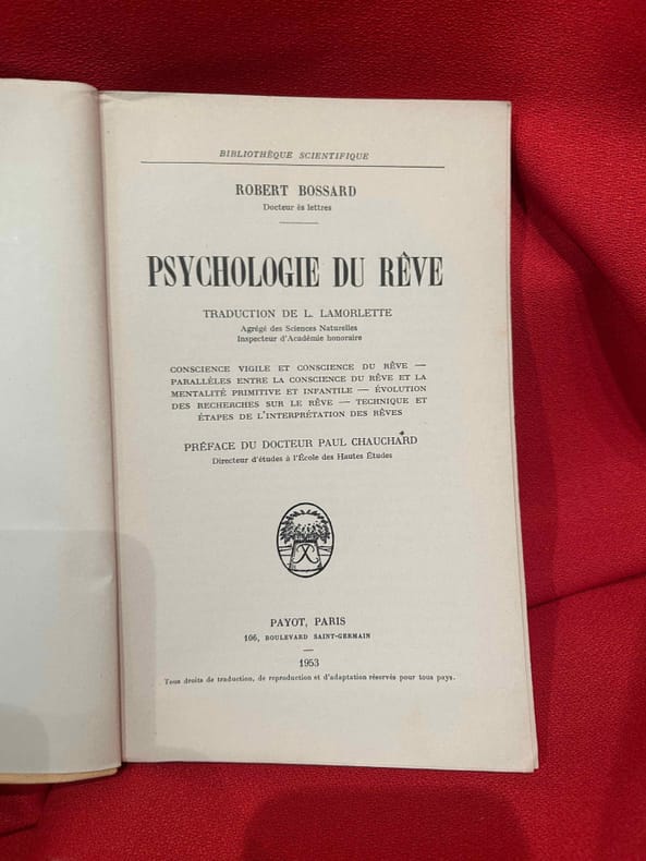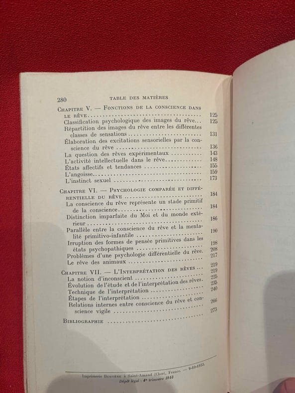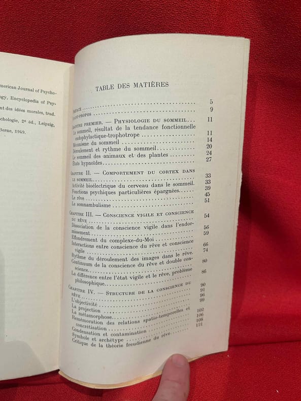 Contents, Chapitres : Physiologie du sommeil - Conscience vigile et conscience du rêve - Structure de la conscience du rêve - Fonctions de la conscience dans le rêve - Psychologie comparée et différentielle du rêve - L'interprétation des rêves - Bibliographie exemplaire ex-bibliotheque, quelques tampons sur la couverture et les premieres pages, sinon bon etat, papier legerement jauni - format de poche