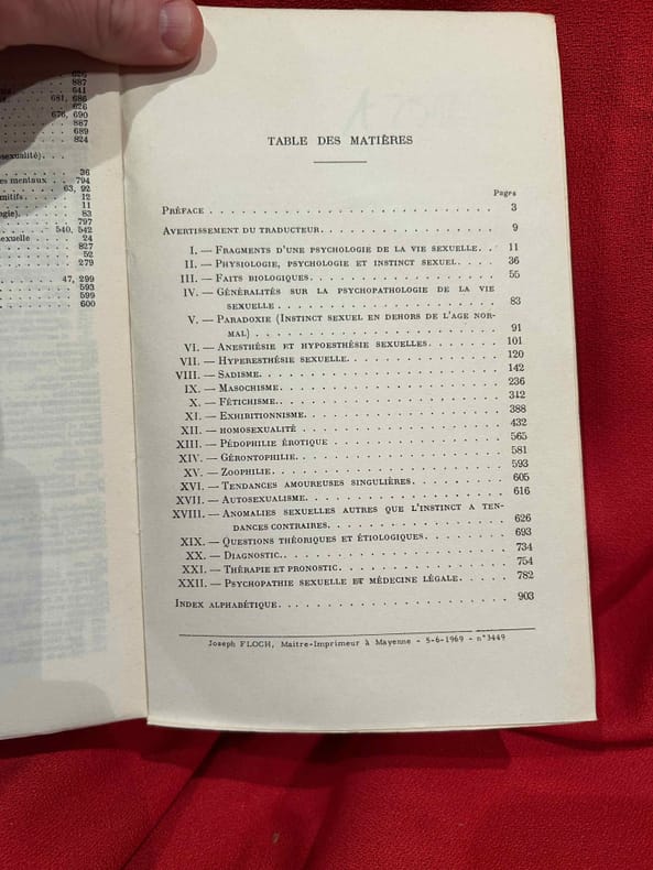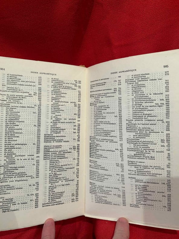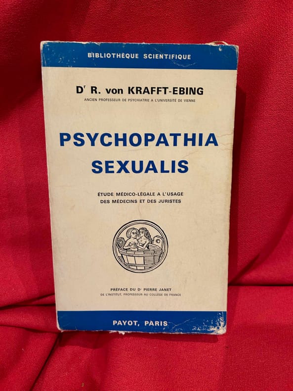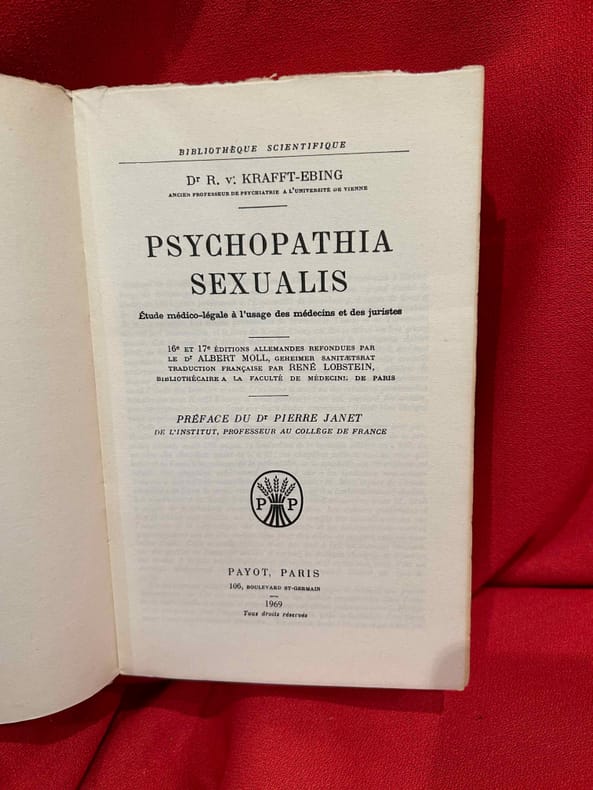 Paris, Payot, 1931, in-8, (2), 906, (2)pp, toile bleue de l'éditeur imprimée en doré (couvertures salies), Première édition de cette seconde traduction réalisée par René Lobstein d'après le travail d'Albert Moll qui refonda les 16e et 17e éditions allemandes. Cette nouvelle édition des "Psychopathia Sexualis" est augmentée de plus de 300 pages et 25 chapitres. A partir d'une étude physiologique et psychologique, l'auteur décrit la totalité "des troubles que peut présenter chez l'homme la conduite sexuelle". Ceux-ci étaient souvent considérés comme des anormalités ou comme des crimes. Ouvrage qui passe en revue et analyse le fétichisme, le sadisme, le masochisme et propose une approche psychiatrique et clinique des différences sexuelles : théorie et étiologie, diagnostic, pronostic et thérapeuthique. Exemplaire un peu jauni et, en partie, non coupé (2), 906, (2)pp.