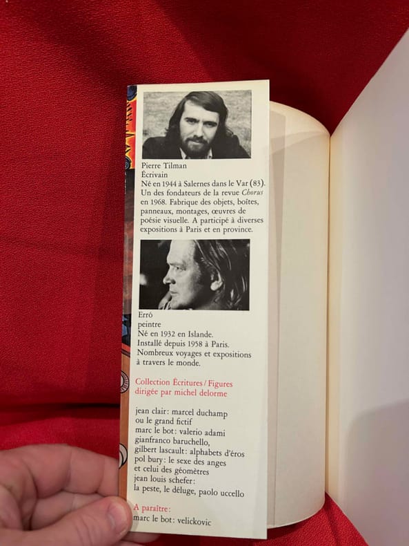Livre d'artiste. 30 dessins érotiques de ERRO reproduit à pleine page face aux portraits photographiques de ses amis, dont Etienne-Mertin, Meret Oppenheim, Martial Raysse, Piotr Kowalski, Daniel Filipicchi, Louis Barnier, Claude Givaudan... et l'artiste lui-même. Tirage à 1000 exemplaires. Très bon exemplaire 0