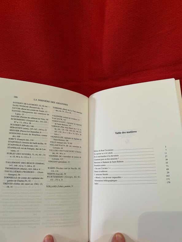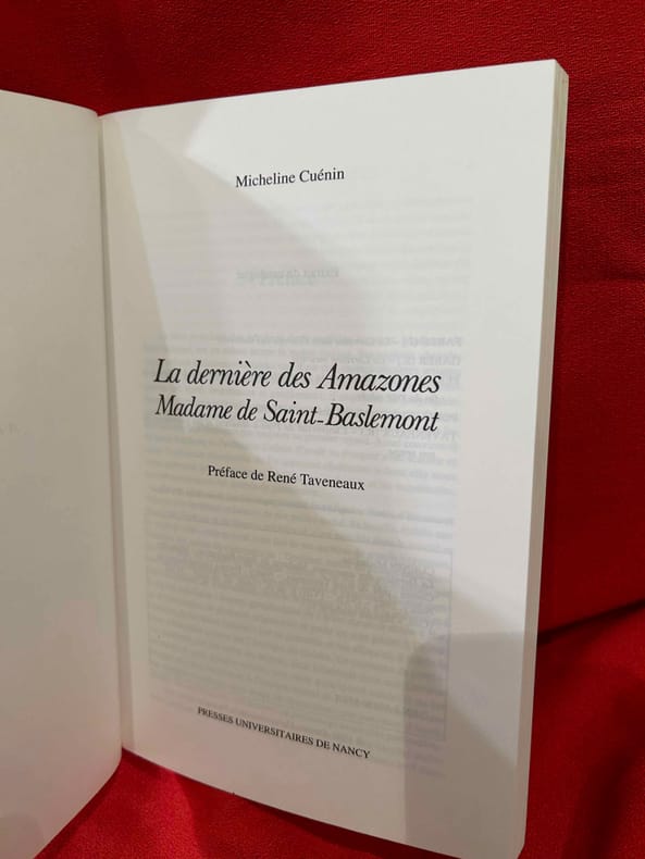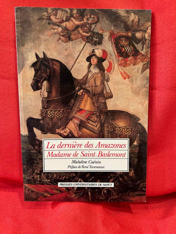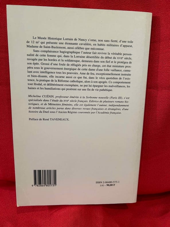 Le Musée Historique Lorrain de Nancy s'orne, non sans fierté, d'une toile de 12 m² qui présente une étonnante cavalière, en habits militaires d'apparat, Madame de Saint-Baslemont, aussi célèbre que méconnue. Sans complaisance hagiographique l'auteur fait revivre la véritable personnalité de cette femme qui, dans la Lorraine désertifiée du début du XVIIe siècle, ravagée par les hordes et la soldatesque, demeura dans son fief et le protégea de son épée. Grossi d'une foule de réfugiés pris en charge, cet état miniature prospéra sous le gouvernement énergique de cette dame d'une folle vaillance, cumulant avec intelligence tous les pouvoirs. Ame de feu, exceptionnellement instruite et bien-disante, elle incarne aussi ce que fut, dans le vécu quotidien de l'existence, la pratique de la Réforme catholique, alors à son apogée. Ce comportement tout féodal, et délibérément exemplaire, ne put lui épargner les malveillances, les haines et les humiliations qui pesèrent sur une fin de vie pathétique.