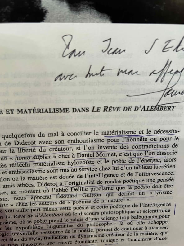 Paris, Honoré Champion Éditeur, 2006 ; in-8, 10 pp., couverture et feuilles agrafées. Tiré à part. Poétique de la Pensée. – Études sur l»âge classique et le siècle philosophique. En hommage à Jean Dagen. Envoi de l’auteur à Édith et Jean Lanher.