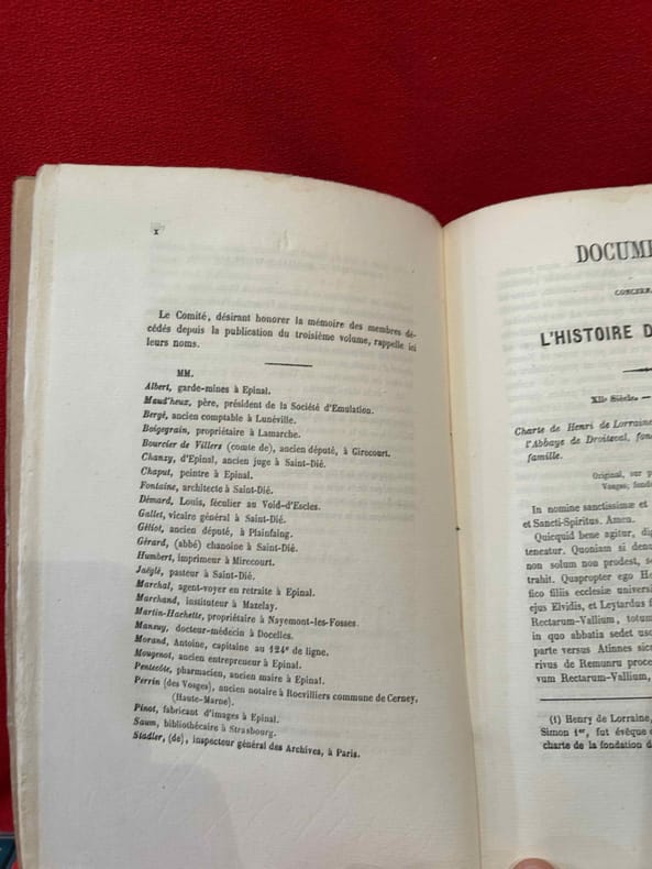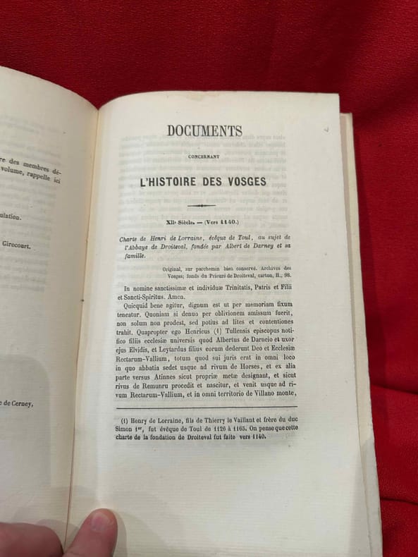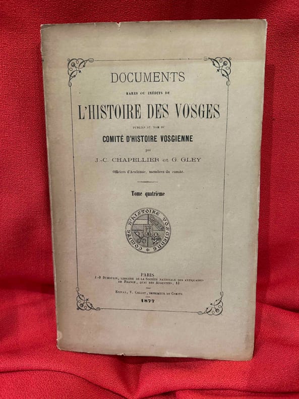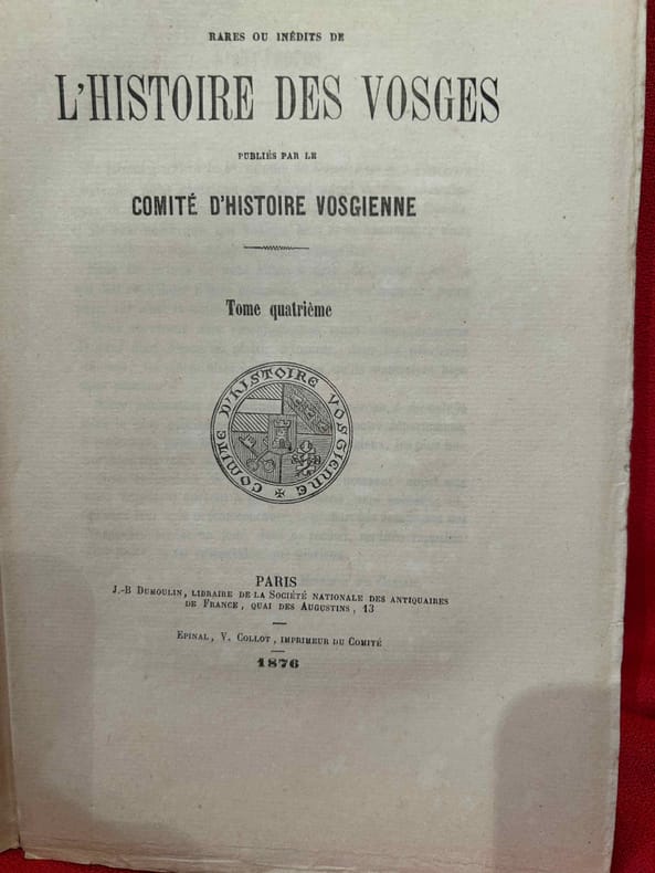 Paris, Jean-Baptiste Dumoulin, Libraire de Société nationale des antiquaires de France, 1877 ; n-8 (151 x 239 mm), 370 pp., broché (non coupé). Publié par le Comité d’Histoire vosgienne.