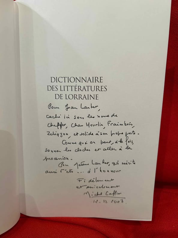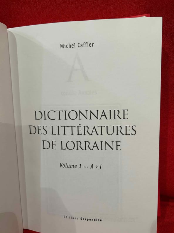 Metz, Serpenoise, 2003 ; in-4, 1046 pp., cartonnage imprimé d'éditeur. Biographie de tous les écrivains connus lorrains ou ayant écrits sur la Lorraine.