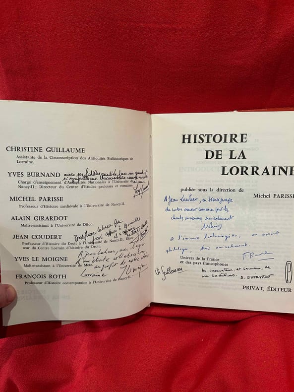Toulouse, Edouard Privat, éditeur, 1977 ; in-8 (183 x 235 mm), 500 pp. + 32 pl. hors-texte, reliure d'éditeur pleine toile, coloris beige, dos lisse, sous jaquette illustrée. Collection «Univers de la France et des pays francophones», N° 38. Exemplaire numéroté 1708/4100. Ont collaboré à cet ouvrage: Christine Guillaume, assistante de la Circonscription des Antiquités Préhistoriques de Lorraine, Yves BURNAND, chargé d'enseignement d'Antiquités Nationales à l'Université de Nancy-II; directeur du Centre d'Etudes gauloises et romaines, Michel PARISSE, professeur d'Histoire médiévale à l'Université de Nancy-II, Alain GIRARDOT, maître-assistant à l'Université de Dijon, Jean COUDERT, professeur d'Histoire du Droit à l'Université de Nancy-II; directeur du Centre Lorrain d'Histoire du Droit, Yves LE MOIGNE, maître-assistant à l'Université de Metz, François ROTH, professeur d'Histoire contemporaine à l'Université de Nancy-II. Envoi des auteurs à Jean LANHER. Nombreuses illustrations en noir et blanc.