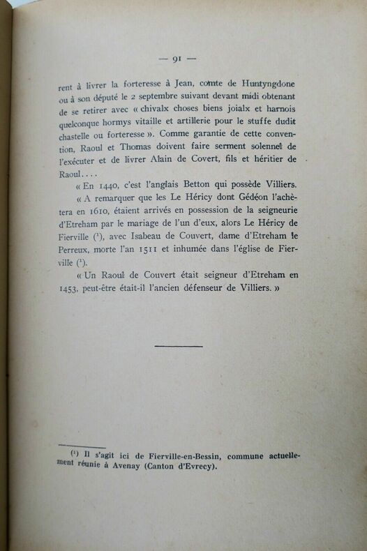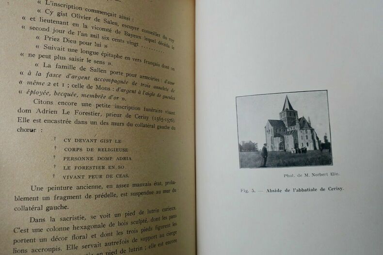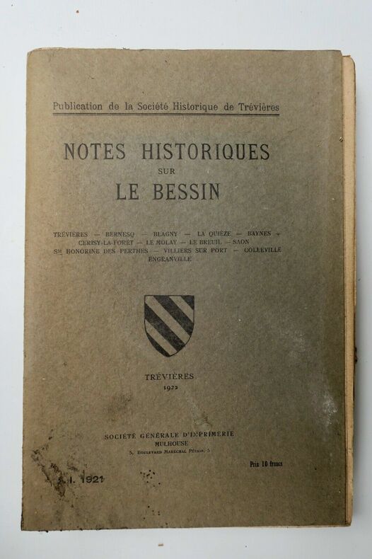Publication de la Société historique de Trévières. Notes historiques sur le Bessin. Mulhouse, Société générale d'imprimerie, Paris, Auguste Picard, L. Jouan et R. Bigot, 1921, in-8, broché (quelque peu défraîchi), 155 pp. Tome I seul . Trévières, Bernesq, Blagny, La Quièze, Baynes, Cerisy-la-Forêt, Le Molay, Le Breuil, Saon, Sainte-Honorine-des-Perthes, Villiers-sur-Port, Colleville, Engranville : 157 pp., avec 10 planches hors texte.