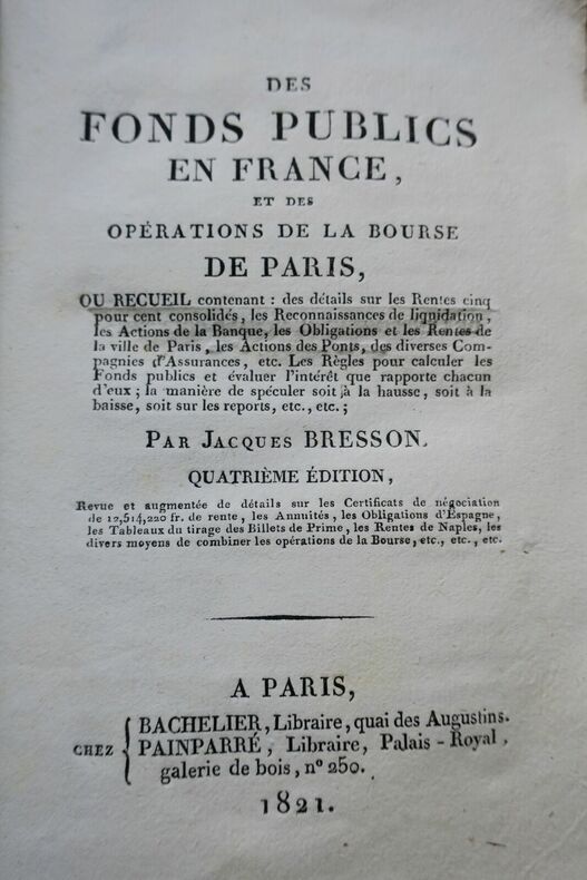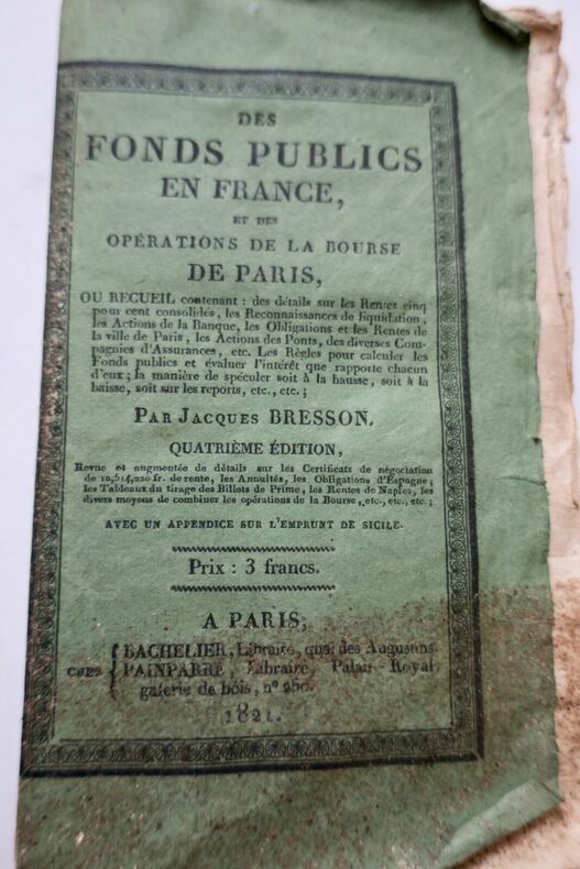 Des fonds publics en France et des opérations de la bourse de Paris 1821 48,00 ? Bresson Des fonds publics en France et des opérations de la bourse de Paris Bachelier & Painparré, libaires. Paris. 1821, broché, non rogné, (salissures en couverture), intérieur frais, in-12, 194 pages, tableaux h.t.