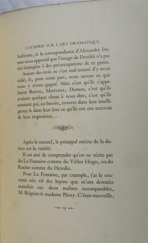 BARTET (MADAME)Causerie sur l'art dramatique.Paris, Edouard Pelletan, 1903. In-8°, belle reliure demi-maroquin à coins, (dos roussi, quelques pâles et rares rousseurs), tête dorée. Couvertures & dos conservés.Tirage unique à 100 exemplaires. Exemplaire n°83 imprimé pour Monsieur Anatole France, portrait par Dagnan- Bouveret, bois décoratifs de Giraldon, gravé par F. Florian.Signature autographe de l'auteur.