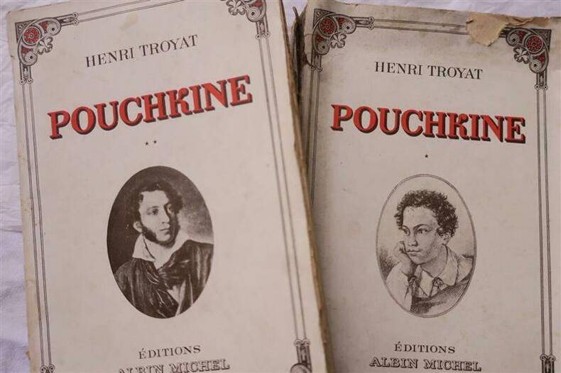 TROYAT (Henri).Pouchkine.Paris, Albin Michel, 15 janvier 1946. 2 volumes in-8°, broché, (couverture en l'état), mériterait une belle reliure, 470 et 510 pp. & table des matières, exemplaire de service de presse. Première édition. Nombreuses planches hors-texteEnrichi d'un envoi de l'auteur