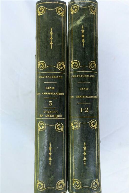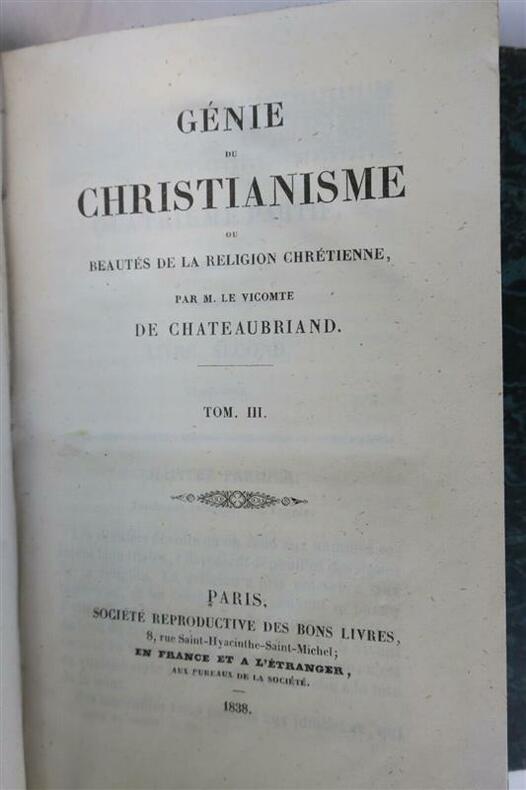 CHATEAUBRIAND (Vicomte Mr le)Génie du christianisme ou beautés de la religion chrétienne & voyages en Amérique moeurs des sauvagesParis, Société reproductive des bons livres/imprimerie de Béthune et Plon 1838/1839; in-8°, 386-396-386 & 399 pp. agréable reliure demi-cuirBel exemplaire
