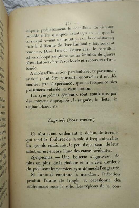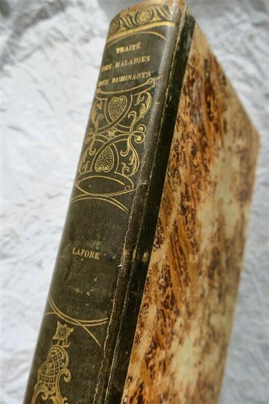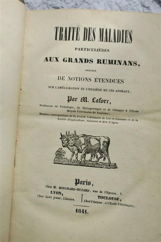 LAFORETraité des Maladies particulières aux grands Ruminants. Précédé de Notions étendues sur l'Amélioration et l'Hygiène de ces Animaux.Paris, chez Bouchard-Huzard, 1841, 20 x 14,5 cm., reliure demi-cuir, coins frottés 1° Des races bovines et de leur amélioration. 2° Hygiène. 3° Maladies de l'espèce. 728 pages. Frontispice par Delore et Perrin : Taureau de race Agenaise du Coteau dessiné d'après nature à l'âge de deux ans