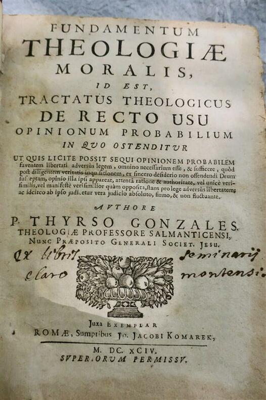 GONZALES THYRSOFundamentum Theologiae moralis id est, tractatus théologicus de recto usu opinionum probabilium in quo ostenditur.Romae, J J Komarek 1694, in 4°, 18 x 24 cm., belle reliure plein cuir, tranches mouchetées, mors fissurés, manque au dos, coins émoussés, 11 ff., 402 pp. & 22 ff. d'index