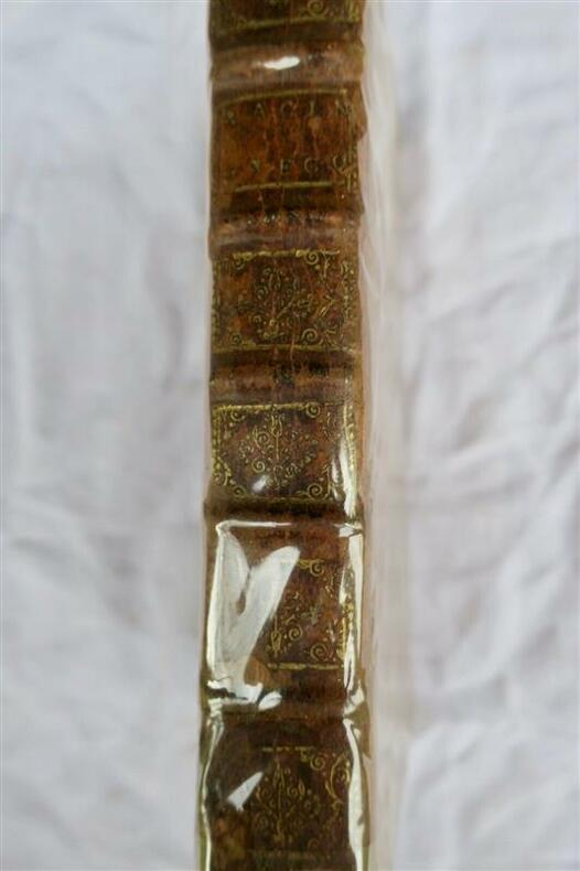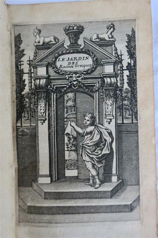 Le jardin des racines greques mises en vers françois avec un traité des prépofitions et autres particules indéclinables et un recueil alphabétique des mots françois tirez de la langue Greque foit par allufion foit par étymolgieParis, Thiboust, 1740. in 12, XI ff., 386 pp., reliure plein cuir de l'époque, tranches mouchetées, manque en coiffes, usures en coins, 394 pages, nom d'un ancien propriétaire en page de titre.