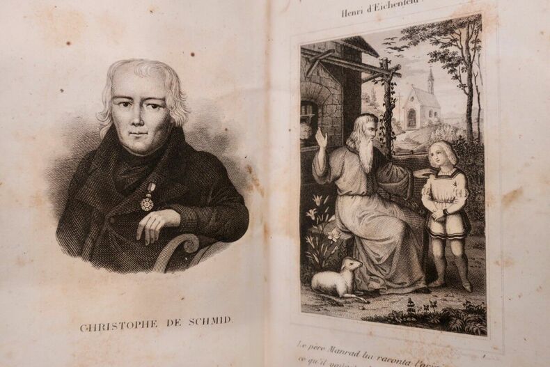 SCHMID (Chanoine) Comment Henri d'Eichenfels parvient a la connaissance de Dieu. Suivi de La bague de Diamant Paris, Michaud, 1841, reliure cartonnée, petits manques en coiffes & au dos., IV & 131 pp., 90 x 138 mm.