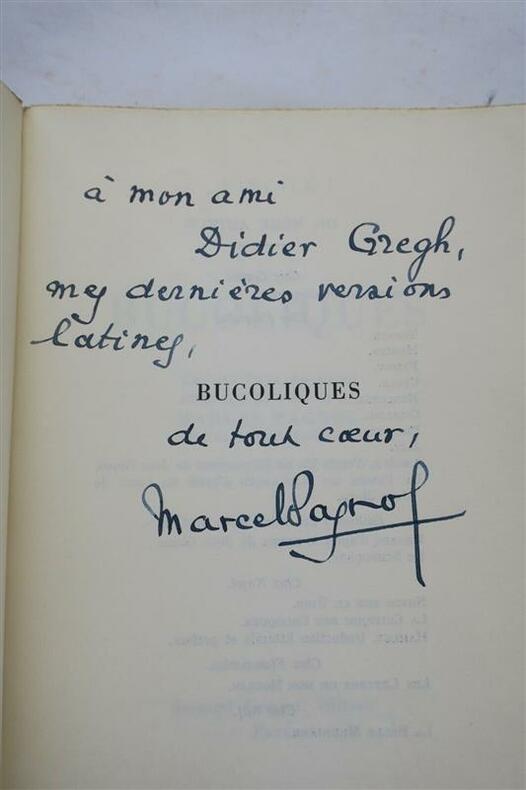 Marcel PagnolVIRGILEBucoliquesGrasset, Paris 1958, 14,5x19,5cm, broché, sous couverture rempliée, 197 pp., petites usures en coiffes, intérieur frais.Edition originale de la traduction française en vers établie par Marcel Pagnol. Couverture illustrée d'un bois d'Aristide Maillol.Bel envoi manuscrite autographe au fils du poète Fernand Gregh, François Didier Gregh alors inspecteur des finances.