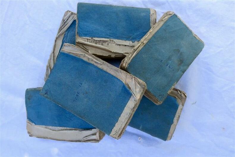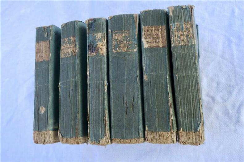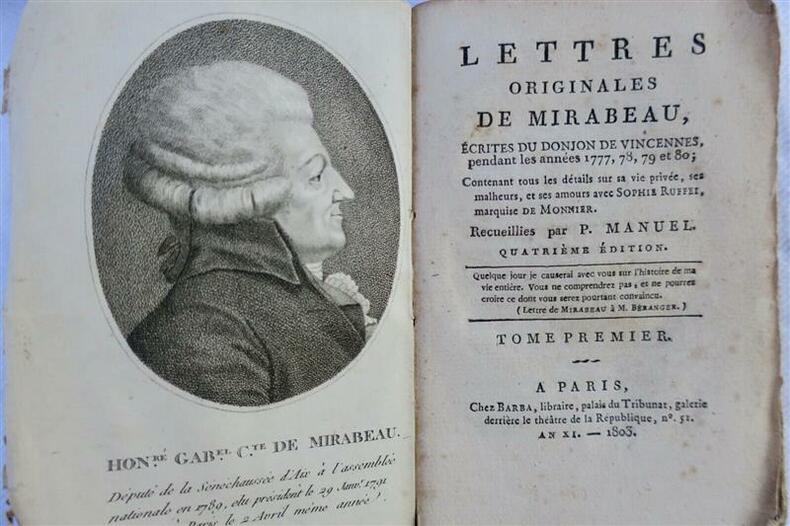 MirabeauLettres originales de Mirabeau, écrites du donjon de Vincennes, pendant les années 1777, 78, 79 et 80; Contenant tous les details sur sa vie privée, ses malheurs, et ses amours avec Sophie Ruffei, marquise de Monnier. Recueillies par P. Manuel. Quatrième Edition.Chez Barba libraire Paris An XI. - 1803, 140 x 90 mm., broché, non rogné sous couvertures d'attente, 286, 286, 359, 324, 284 & 284 pp.Manque le volume VI & VII