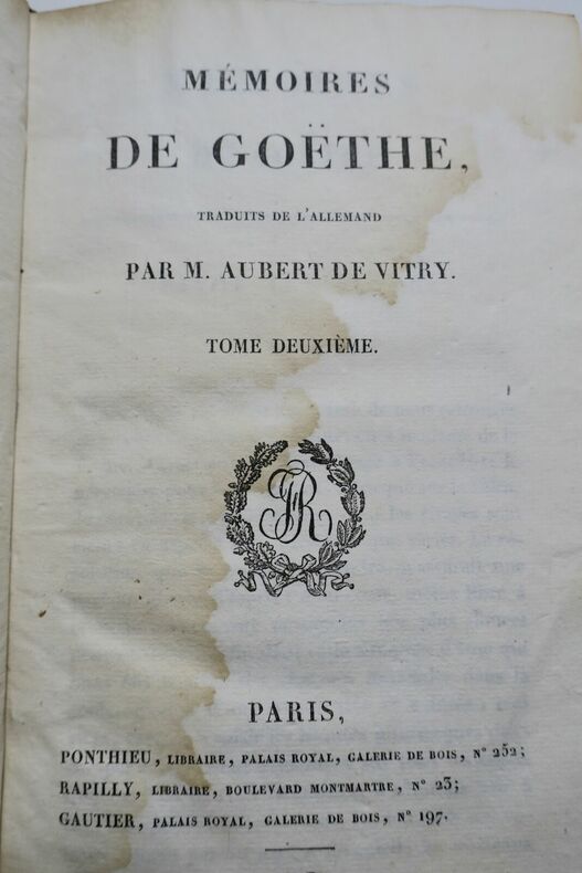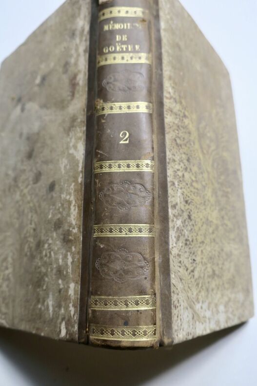 de Vitry, Baron Francois-Jean P. Aubert Mémoires de Goethe Paris: Ponthieu, Rapilly, Gautier, 1823, 508 pp., in 8°, reliure demi-cuir, tranches citron, manque en coiffe supérieure, quelques traces de mouillures légères. Tome second uniquement