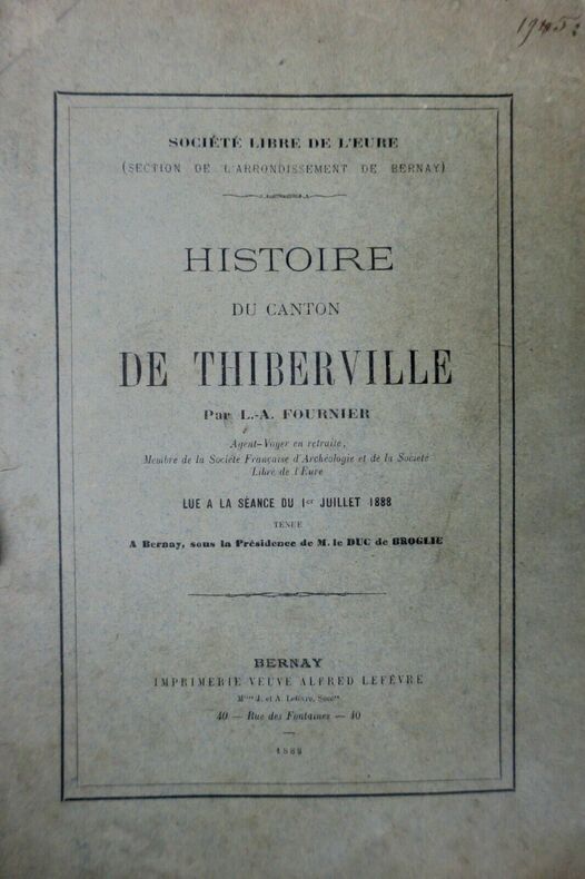 L.A. Fournier Histoire du canton de Thiberville Bernay, A. Lefevre, 1888, in 8, broché (couverture en l'état : dos fendu, intérieur bien conservé). Fort rare Les origines de Thiberville, domaine de Theodebert, qui fut le premier évêque de Lisieux au VIe siècle. Il retrace l'histoire de chaque village, nous explique quel fut le développement de l'industrie du tissage dans le canton, et la transformation des méthodes de fabrication. Il souligne l'importance des manufactures rubanières au siècle dernier. L.-A. Fournier fait revivre aussi les sites empreints de souvenirs, comme le château du Beaudrieux, domaine de la famille de Rivière des 1547, ou le manoir...