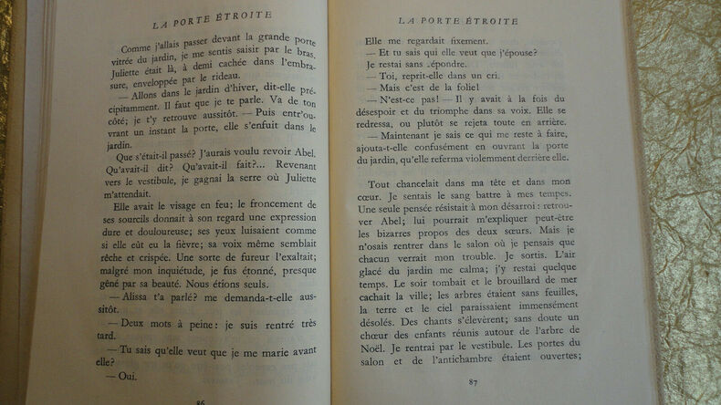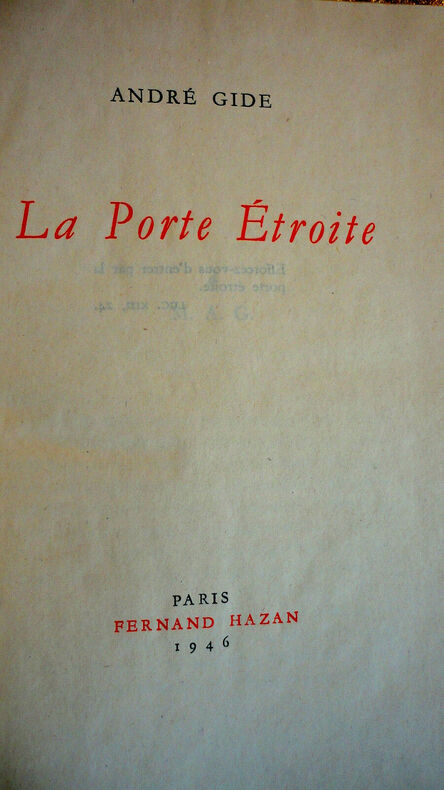 Andre GIDE La porte étroite Paris, Fernand Hazan, 1945, in-12, 202 pages sur papier Bible ; jolie cartonnage éditeur, filets d'encadrement noirs et dores, plats ornes de motifs décoratifs entrelacés, titre au centre en lettres dorées