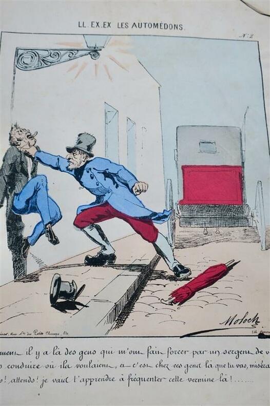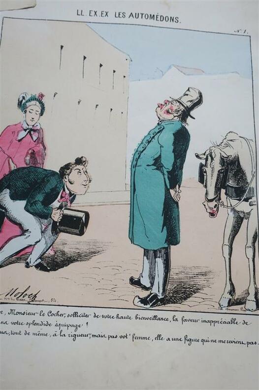 MOLOCH Pseudonyme de Alphonse Hector COLOMBL. L. EX EX LES AUTOMÈDONS par MOLOCH 24 lithographies sur les COCHERS de FIACREParis . Deforêt et César, (circa 1871). Une page de titre et 23 lithographies, 23 x 26 à 29 cm., sous chemise cartonnée à lacets (coins émoussés, dos fendu), quelques manques en marges des feuilles & frangé le plus souvent.Bien rare