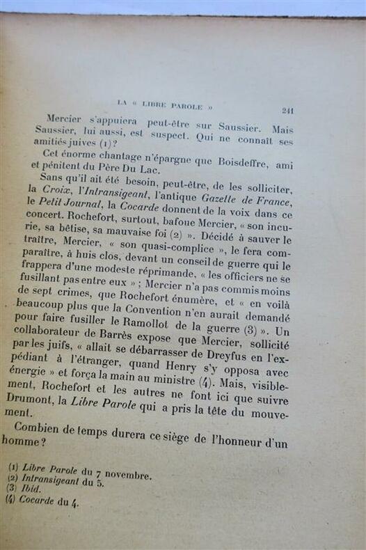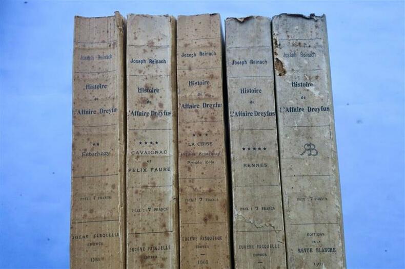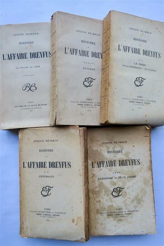 Joseph ReinachHISTOIRE DE L'AFFAIRE DREYFUSEditions de la Revue blanche - Librairie Charpentier et Fasquelle, 14,5 x 22,5 cm., brochés, couvertures défraîchie ou quelque peu abimées.TOME 1 - 1901 - 640 pages TOME 2 - ESTERHAZY - 1903 - 718 pages TOME 3 - LA CRISE - PROCÈS ESTHERHAZY - PROCÈS ZOLA - 1903 - 661 pages TOME 4 - CAVAIGNAC et FÉLIX FAURE - 1904 - 634 pages TOME 5 - RENNES - 1905 - 591 pagesEnrichi d'envois de l'auteur au poète Fernand Gregh au tome I, à Madame Jules Comte au tome II & au tome V à Mme Gregh
