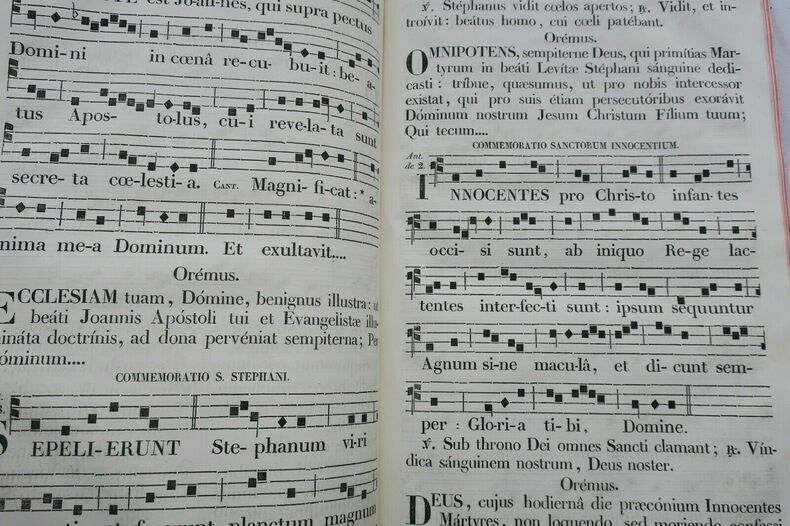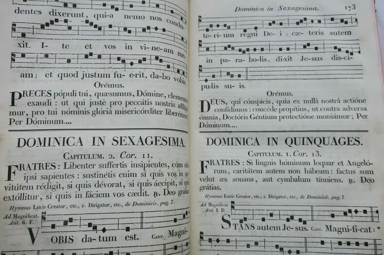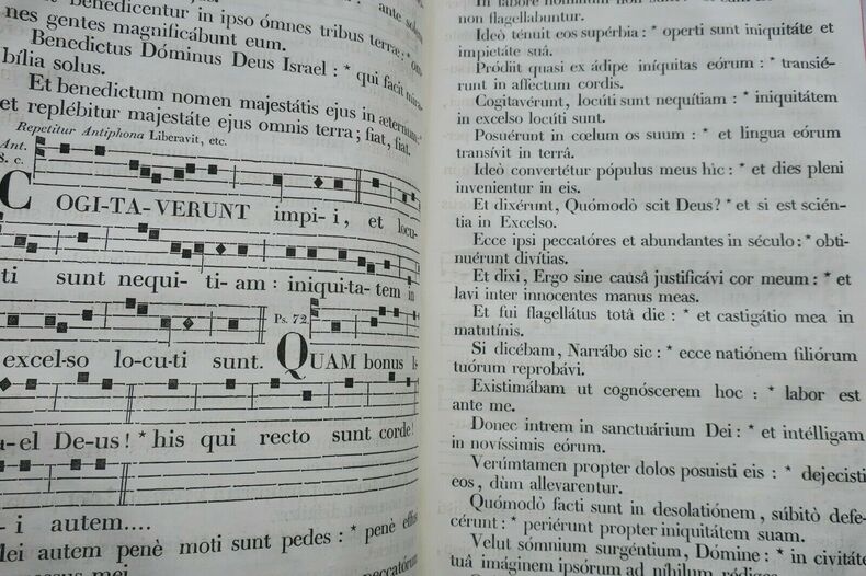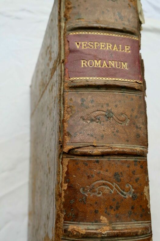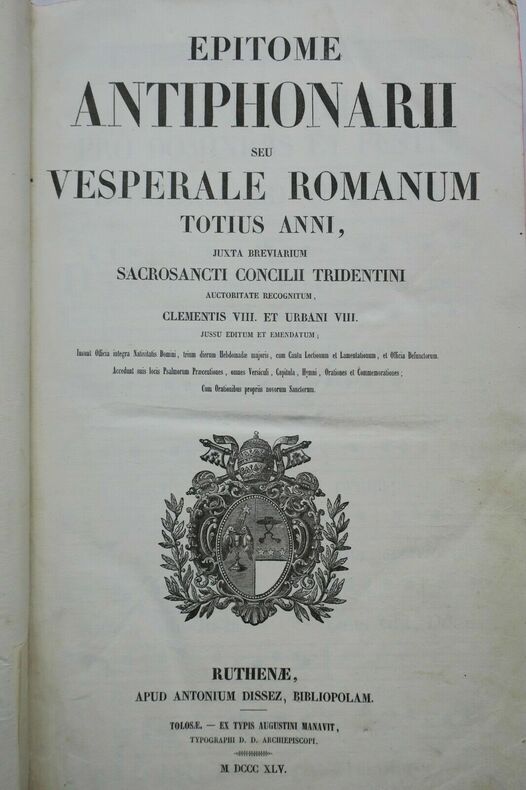 Epitome antiphonarii seu vesperale Romanum totius anni, juxta breviarium sacrosancti Concilii Tridentin: auctoritate recognitum, Clementis VIII. et Urbani VIII. jussu editum et emendatum. Ruthenae, Antonium Dissez; Tolosae, Ex typis Augustini Manavit, 1845 , 26 x 41 cm, reliure plein cuir, tranches brique, 576 pp., CXII, XXXIV, 30 pp., 3 feuillets restaurés en marges Les envois hors de l'union européenne sont payants