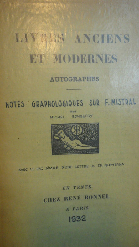 LIVRES ANCIENS ET MODERNES autographes notes graphologiques sur F. Mistral par Michel Bonnefoy avec le fac-simile d'une lettre à de Quintana Chez Rene Bonnel Paris, 1932, broché, in 8, 131 pp., 496 lots décrits. Catalogue de libraire fort interessant