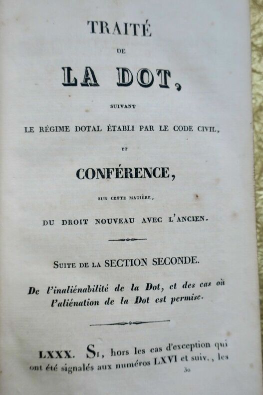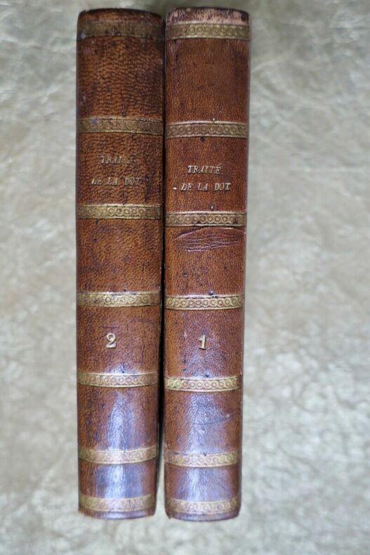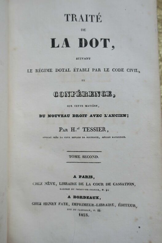 Tessier (H.), Traite de la dot suivant le régime dotal établi par le code civil, et conférence sur cette matière, du nouveau droit avec l'ancien Neve et Faye, 1835, 2 vol. in-8 de VIII-463 et 460 pp., belle reliure demi-cuir, tranches marbrées joliment. Bien rare