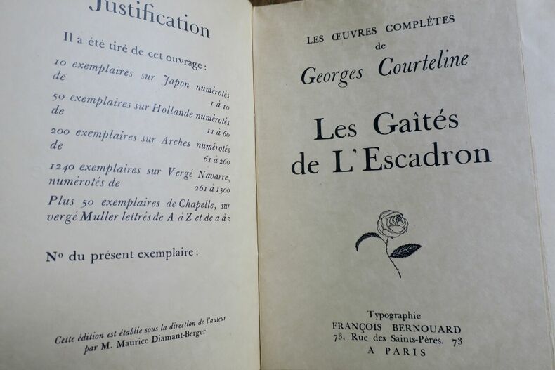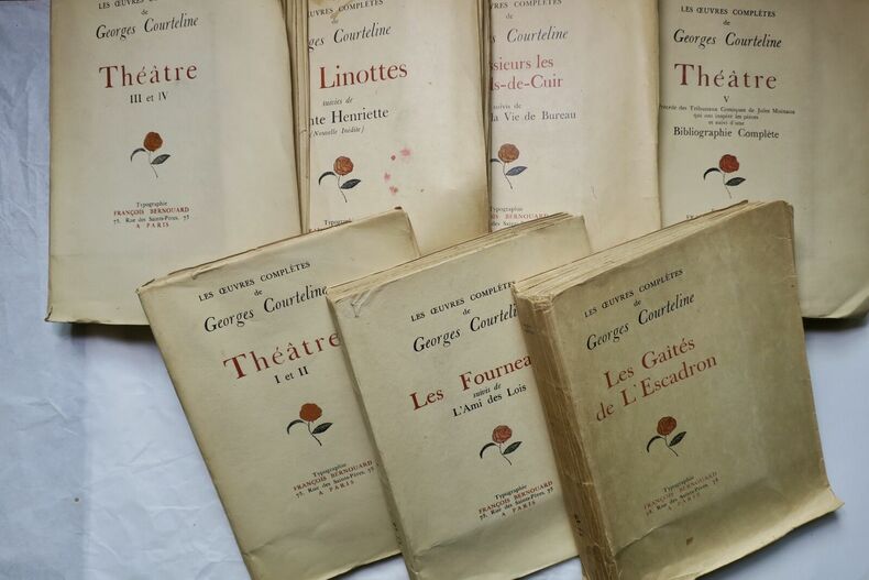 Georges COURTELINE Les oeuvres complètes de Georges Courteline Paris, Typographie François Bernouard, 1926, in 4°, soit 7 volumes, exemplaires à toutes marge. Edition revue, corrigée, augmentée et préfacée par l'auteur, couvertures défraîchies, intérieurs frais. Théatre (3 volumes, I, II, III, IV & V), les Fourneaux, est sur Arches (non numéroté) Messieurs les Ronds-de-cuir, les linottes & les gaïtés de l'escadron est sur papier Japon (non numéroté). Les envois hors de la France métropolitaine sont payants