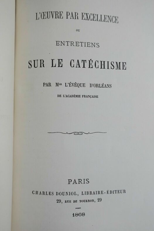 DUPANLOUP L'OUVRE PAR EXCELLENCE OU ENTRETIENS SUR LE CATECHISME PAR MGR L'EVEQUE D'ORLEANS. PARIS LIBR. ED. CHARLES DOUNIOL 1869 LIBR. ED. CHARLES DOUNIOL, 1869, 610 pp., reliure demi-chagrin; Assez rare