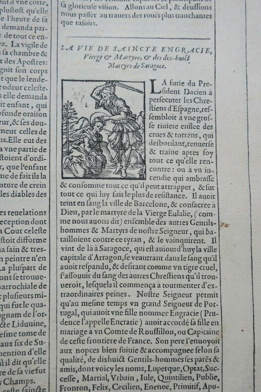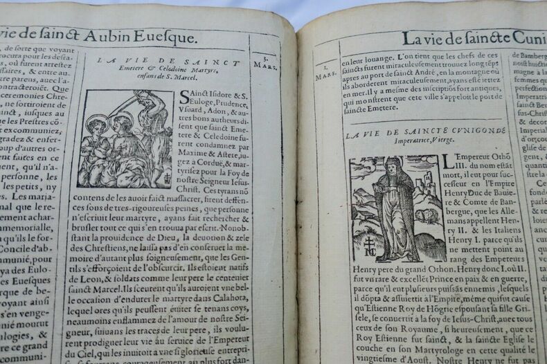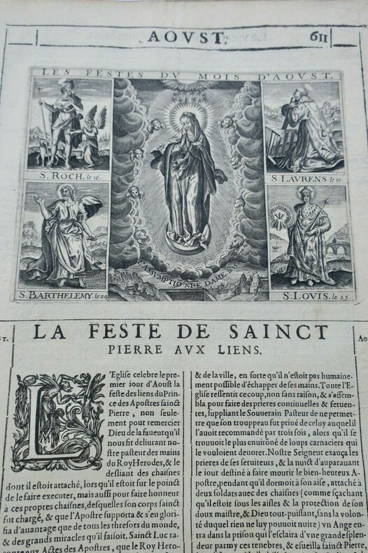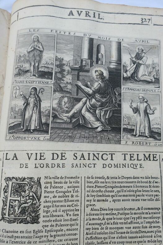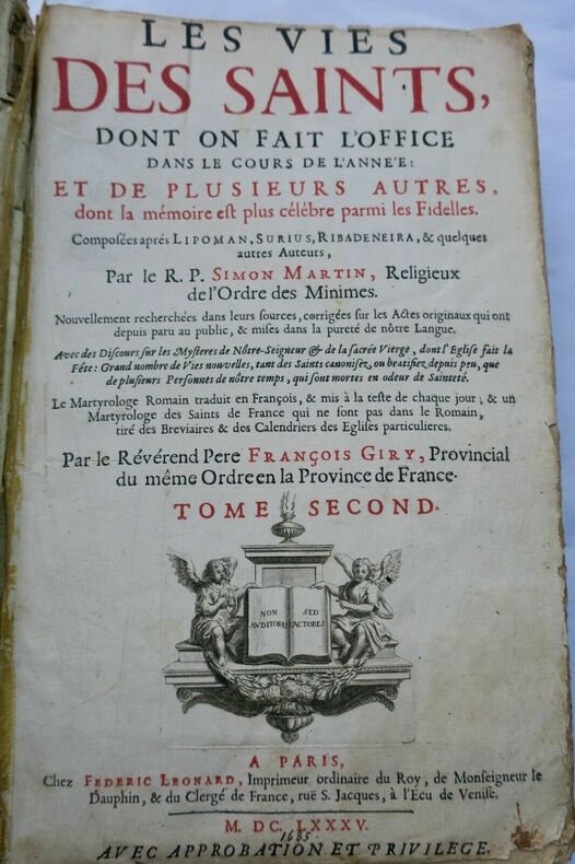 MARTIN Simon; GIRY François. Les vies des saints dont on fait l'office dans le cours de l'année et de plusieurs autres, dont la mémoire est plus célebre parmi les Fidelles.. A Paris, chez Federic Léonard, 36 x 24 cm, reliure quasi disparue, reste les 2 plats cartonnés, 1078 pages & 4 ff. de table, & 73 pages des vies des bien-heureux pères de la Cie de Jésus., page de titre frangée, manque partiellement le texte sur le feuillet de prologue, (19 derniers feuillets comportent un manque en coin & manque qui atteint 14 feuillets au texte), par ailleurs intérieur assez bien conservé. Belles gravures synoptiques représentant les saints et les fêtes majeures avant les tableaux chronologiques en frontispice aux différents mois & orné de nombreuses vignettes . Manque le tome premier Les envois hors de l'union européenne sont payants