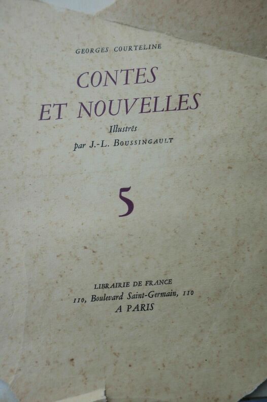 Contes et nouvelles. Illustrations par DIGNIMONT et J.-L. BOUSSINGAULT Librairie de France, intérieur bien conservé, non rogné, 334 pages, in 8°, 1931 ; couverture en l'état, un cahier lâche. Un des exemplaires sur vélin d'arches numéroté, ici le n°590, au filigrane de Courteline, mais sans la suite