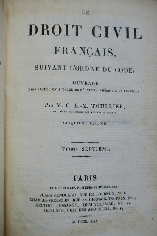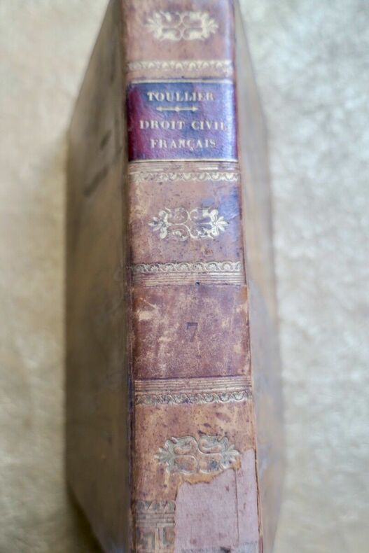 LE DROIT CIVIL FRANÇAIS SUIVANT LORDRE DU CODE 1830 37,00 ? TOULLIER (Charles-Bonaventure-Marie) LE DROIT CIVIL FRANÇAIS SUIVANT LORDRE DU CODE, OUVRAGE DANS LEQUEL ON A TACHÉ DE RÉUNIR LA THÉORIE À LA PRATIQUE, vol. I à VI (mq. vol. VII à XV) Paris Renouard / Gosselin / Bossange /Lecointe 1830, in-8°, 726 pp., volume 7 ème uniquement, belle reliure plein cuir, tranches marbrées.