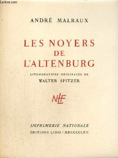 L'illustration comprend 16 lithographies et eaux-fortes originales en noir et rouge de Vladimir Velickovic dont 6 hors-texte et 10 en double-page. Avec une préface de Yves Benoit-Cattin. Le cri du peuple serbe. Achevé en 1941 et publié en 1948, Malraux exprima dans Les Noyers de l’Altenburg le dénuement de la vie humaine face à la peur de la mort. Le récit devait comporter une suite mais elle fut détruite par la Gestapo pendant la guerre. Velickovic reconnu au cœur de ce récit le destin du peuple Serbe qu'il traduisit en compositions formées de figures saisies en plein vol par des élans de force et des contorsions, échos à la rage vivre de Malraux. Cette édition fut tirée à 210 exemplaires sur vélin d’Arches, tous signés par l’artiste. Celui-ci est un des 180 réservés aux sociétaires. Parfait exemplaire.