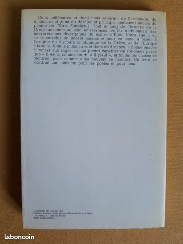 Monaco, Éditions du Rocher, coll. Gnose, 1979, in-8, br., 180 p., bibliogr. Contient : un essai sur la récupération de Parménide ; trad. française avec commentaires ; les succeseurs : Zénon et Mélissos. Dos et bords insolés, autrement bon état.