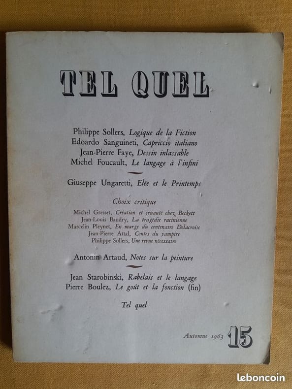 Paris, Seuil, 1963, 18 x 22.50 cm, broché, 94 p. Contributions de Ph. Sollers, "Logique de la fiction" ; Jean-Pierre Faye, "Dessin inlassable" ; Michel Foucault, "Le langage à l'infini" ; Antonin Artaud, Jean Starobinski et Pierre Boulez entre autres.