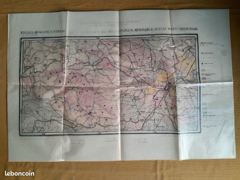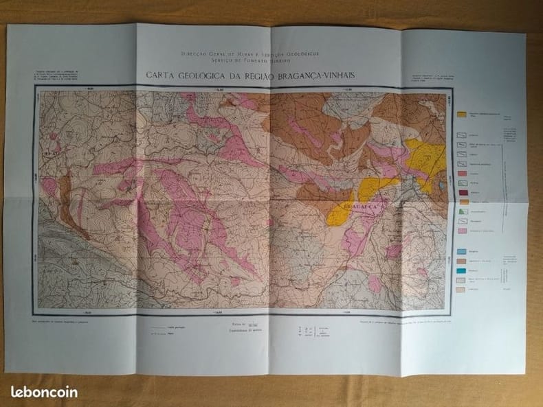 Porto, Ministério da Economia. Direcção Geral de Minas e Serviços Geológicos. Serviço de Fomento Mineiro, 1948, in-4, br., 251 pp. Travail de référence et inhabituel, abondamment illustré, avec cartes géologiques de la région concernée, dépliantes et volantes (insérées dans un portefeuille au 2e plat). Présence d'un ex-libris et d'un hommage de l'auteur manuscrit en page de faux-titre. Marques d'usures aux plats et au dos, sans gravité. Intérieur propre et ferme, complet des cartes. Ouvrage peu commun.