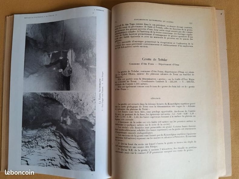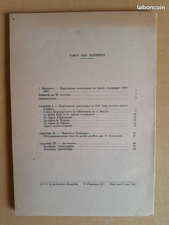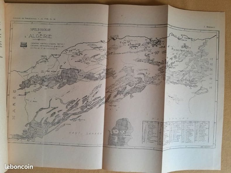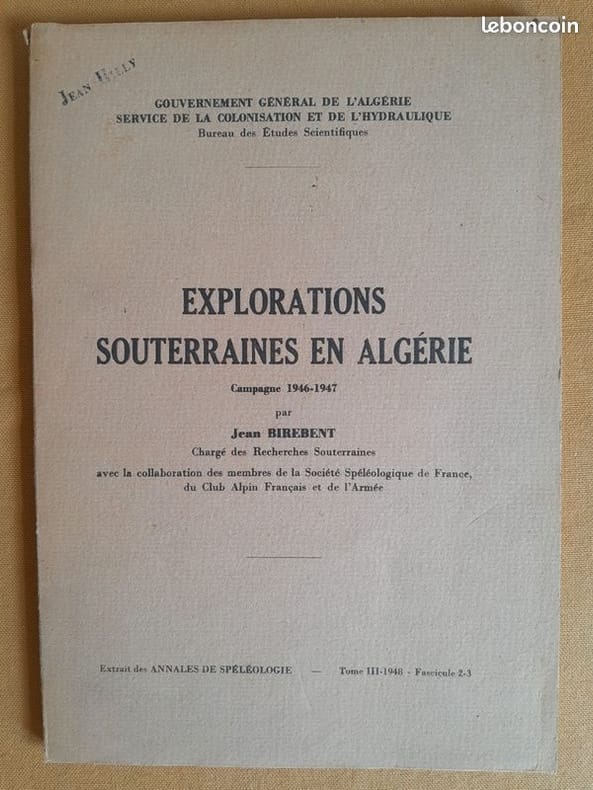 Alger, Gouvernement général de l'Algérie. Service de la colonisation et de l'hydraulique. Bureau des études scientifiques, 1948, in-8, br., 152 p., nombreuses cartes, dont 2 dépliantes, dessins et photos en noir. Extrait des Annales de spéléologie – tome III-1948 - Fascicule 2-3. Ouvrage écrit avec la collaboration des membres de la Société spéléologique de France, du Club alpin français et de l' Armée.