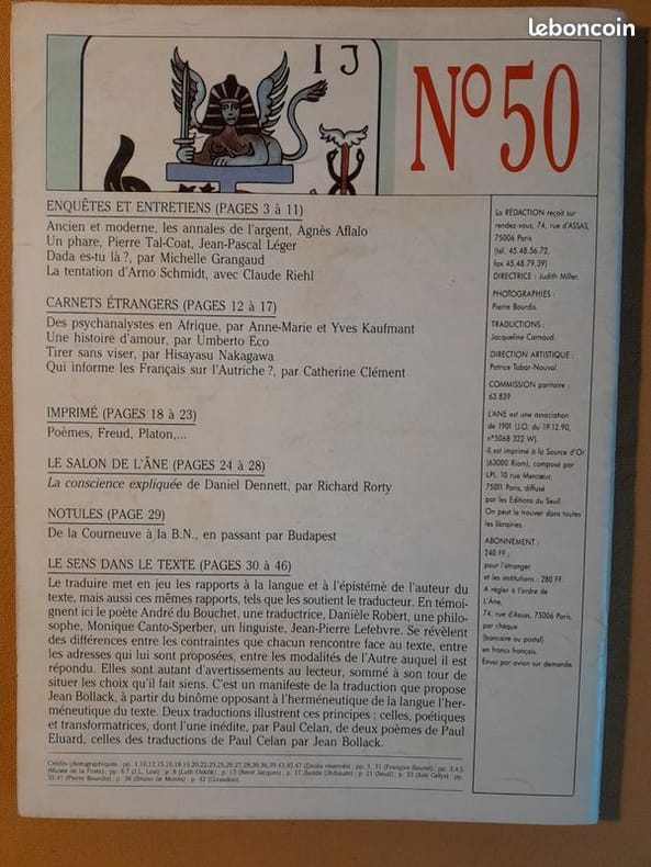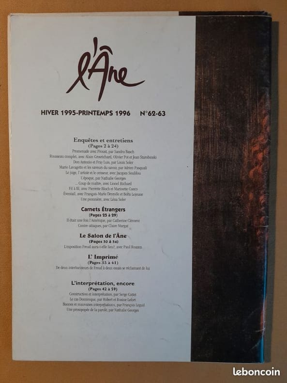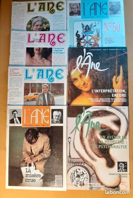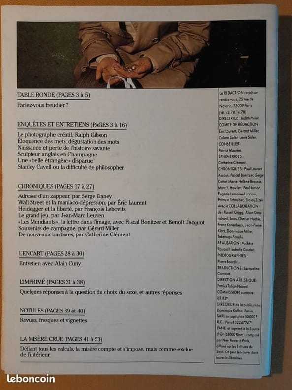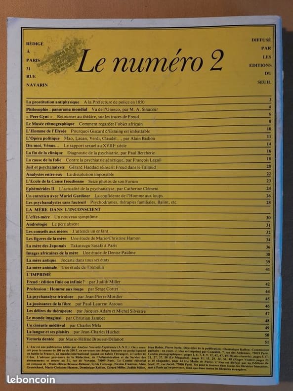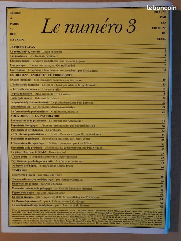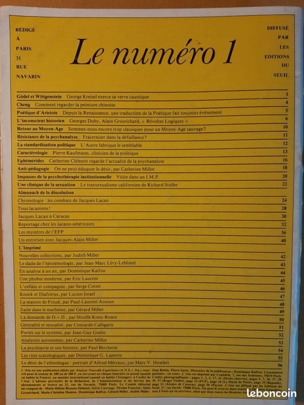Magazine in-folio, broché, couverture souple, illustrations couleurs, contient divers articles “lacaniens” écrits par et sur Jacques Lacan, Gérard Miller, Kalfon, Gérard Haddad, Alain Badiou, Catherine Clément, Serge Daney, Slavoj Zizek, etc. Sommaires en photos.