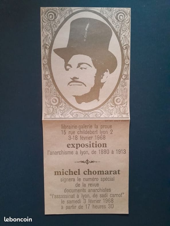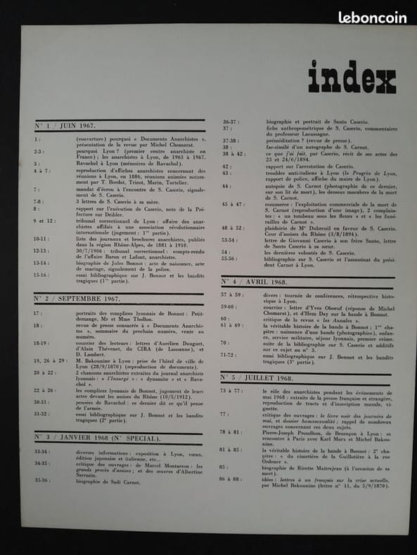 Intégrale de cette revue animée par Jean Besacier, directeur de publication, alias Michel Chomarat, futur créateur/donateur/animateur du Centre de ressources documentaires gay et lesbiennes à la Bibliothèque municipale de Lyon. Typographe de formation, la mise en page chiadée tranche avec les usuels tracts libertaires. Au sommaire, nombreux documents, dont certains inédits sur : l'anarchie et la franc-maçonnerie, l'assassinat à Lyon de Sadi Carnot par Caserio, Michel Bakounine, la bande à Bonnot, Bakounine/Kropotkine, l'origine du drapeau noir, Balzac et la révolte des Canuts, Paul Verlaine et Louise Michel, Jules Vallès, chansons anarchistes inédites de 1893 ; complétées par des rubriques bibliographiques. Le sous-titre varie légèrement dès le n°2 [l'histoire du mouvement anarchiste français (région rhône-alpes) publiée en fascicules] avant de disparaître complètement en 1969. Index couvrant la totalité des numéros en fin du n°12. Nous y joignons un index volant couvrant les 6 premiers numéros (tirés sur un papier bouffant de meilleure qualité que les 6 suivants) et surtout une affichette (20,5x50cm sur papier kraft) annonçant l'exposition "L'Anarchisme à Lyon, de 1880 à 1913" à la librairie-galerie La Proue (3-18 février 1968) et la présence de Michel Chomarat qui signait le n°3 consacré à l'assassinat de Sadi Carnot.