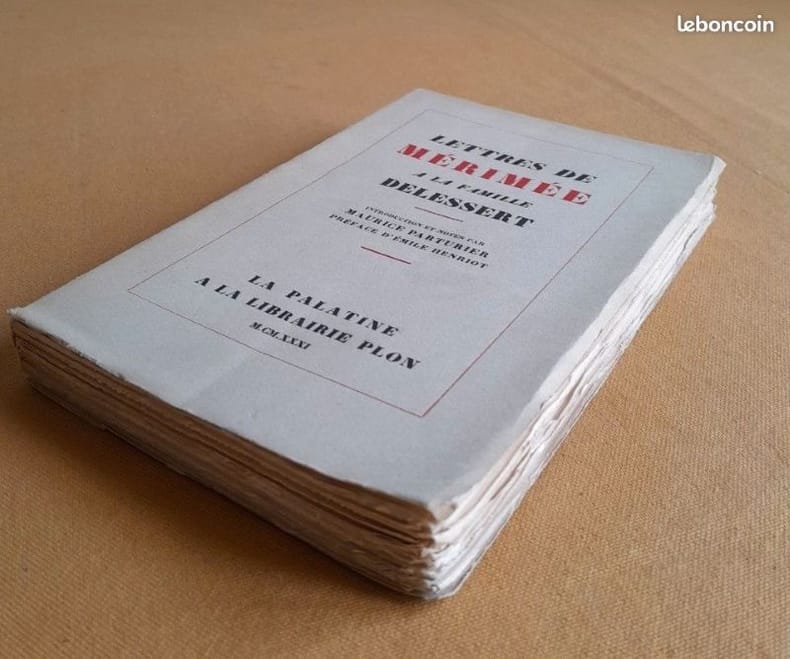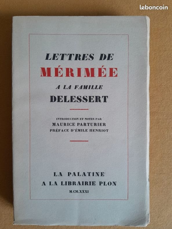 Correspondance de Mérimée avec plusieurs membres de la famille Delessert, dont Mme Gabriel Delessert, née de Laborde, et qui fut l’égérie de l’écrivain.ENVOI a.s. de Maurice Parturier à Léon Massis : "j’offre ce Mérimée orléaniste malgré tout, avec l’hommage de l’éditeur"... Rares rousseurs pâles négligeables, bonne condition. - Frais de port : -France 4,95 € -U.E. 9 € -Monde (z B : 15 €) (z C : 25 €)
